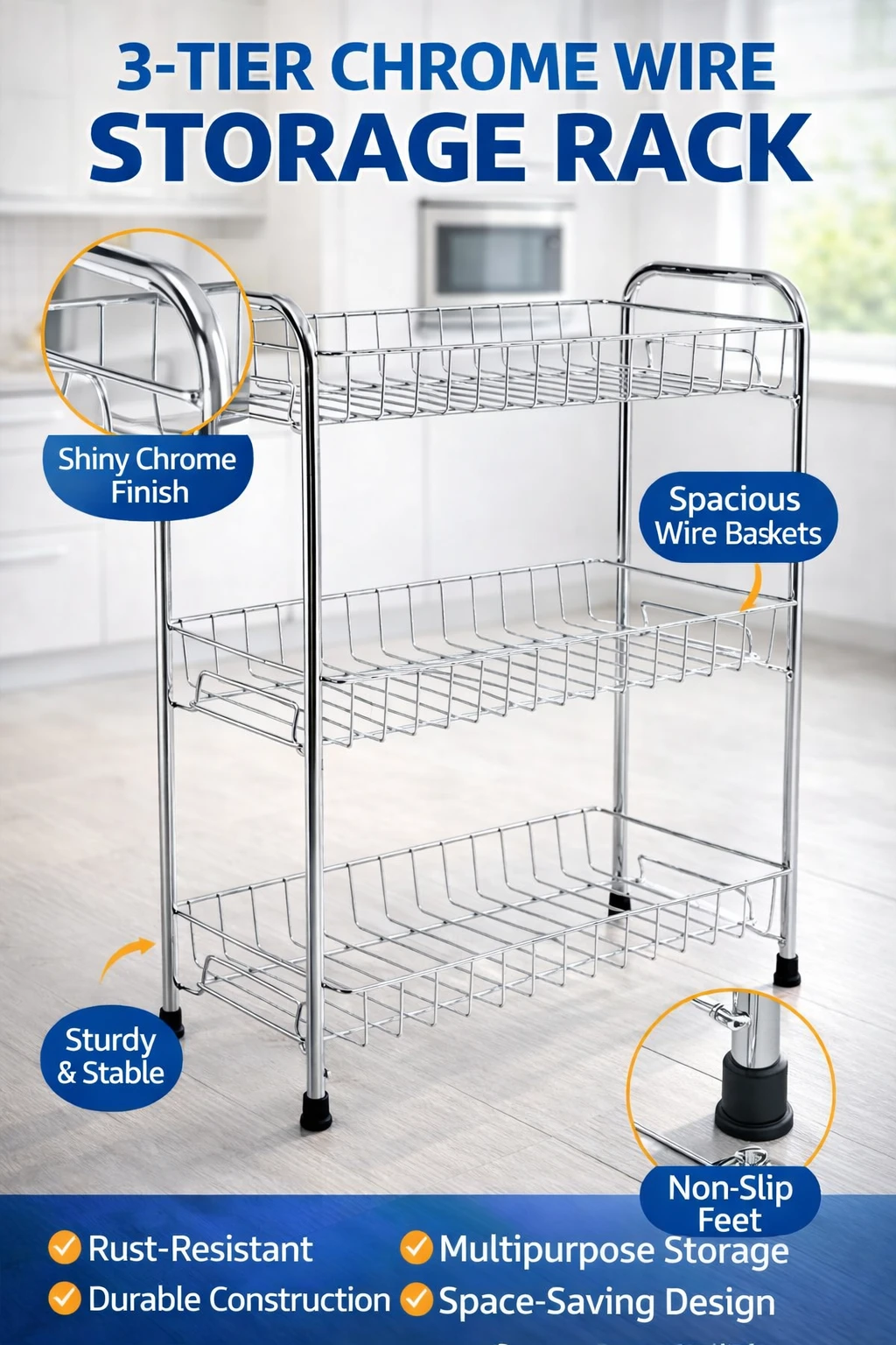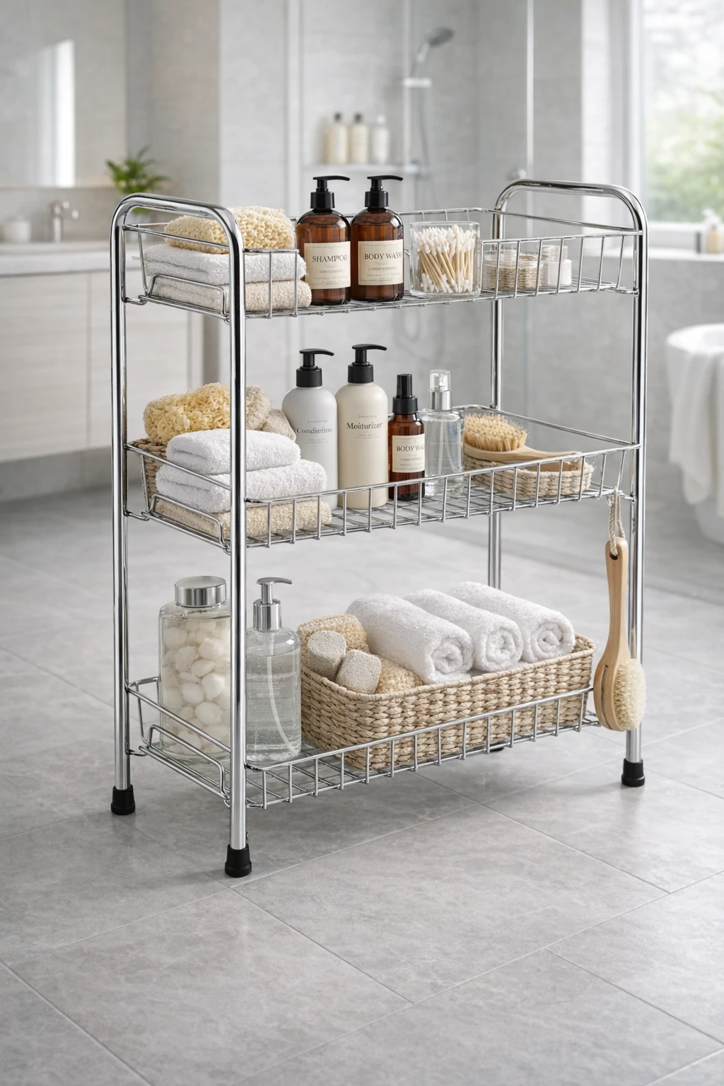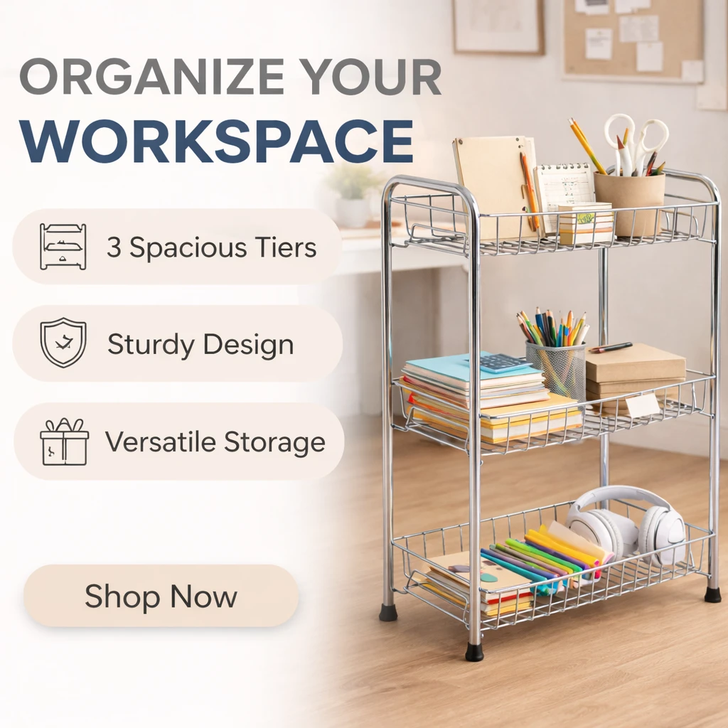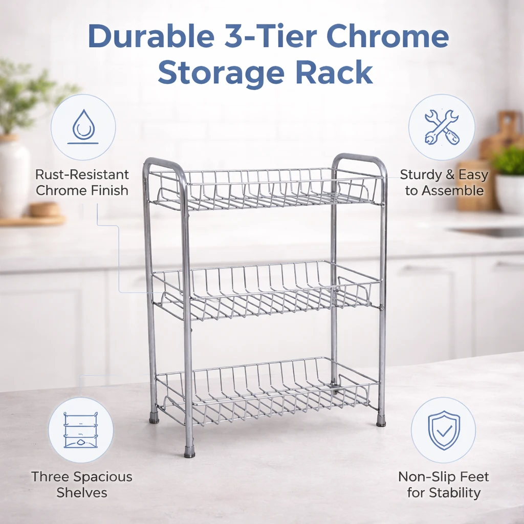 Upgrade your home organization with this 3 Tier Stainless Steel Storage Rack, designed to maximize storage while saving countertop space. Built with durable rust-proof stainless steel, this multipurpose rack is perfect for organizing kitchen essentials, bathroom toiletries, office supplies, and household items. The three spacious tiers provide ample storage for spice jars, bottles, vegetables, toiletries, or daily essentials, keeping everything neatly arranged and easily accessible. Its compact design (40×20×52 cm) makes it ideal for countertops, cabinets, pantry shelves, and bathroom spaces. With a strong and stable structure, this organizer rack ensures long-lasting performance and supports heavy items without bending. The modern silver finish blends seamlessly with any kitchen or home décor. Whether used in the kitchen, bathroom, pantry, office, or bedroom, this versatile storage rack helps keep your space tidy and clutter-free. Key Features