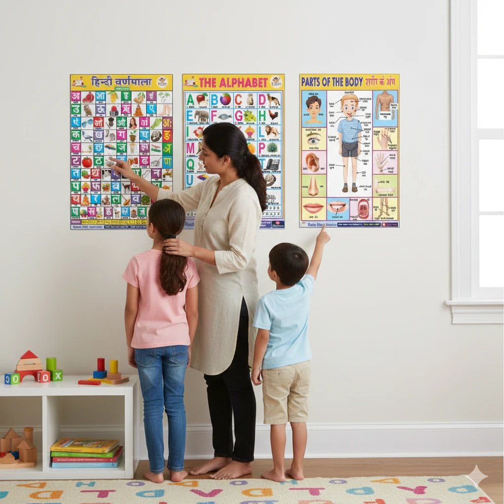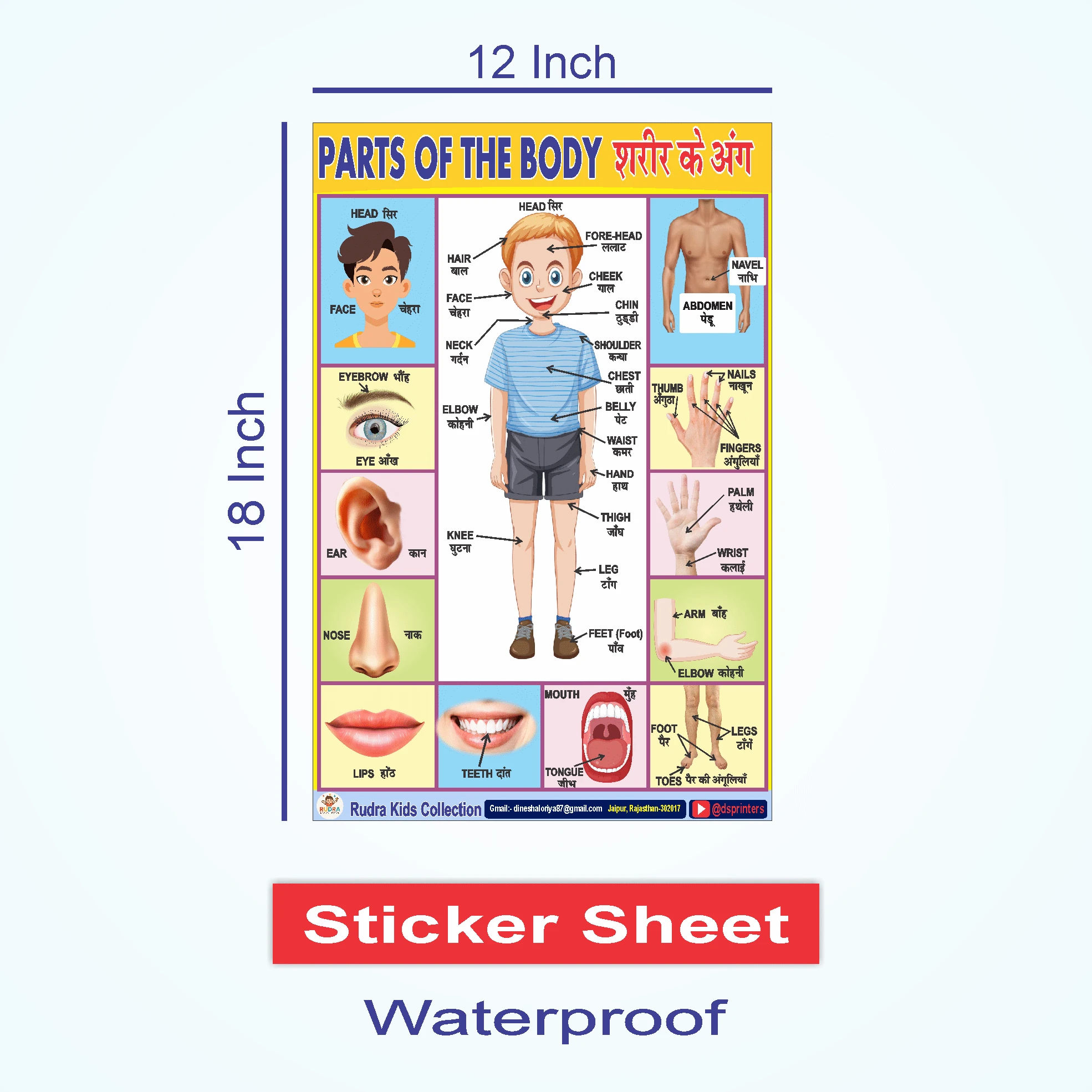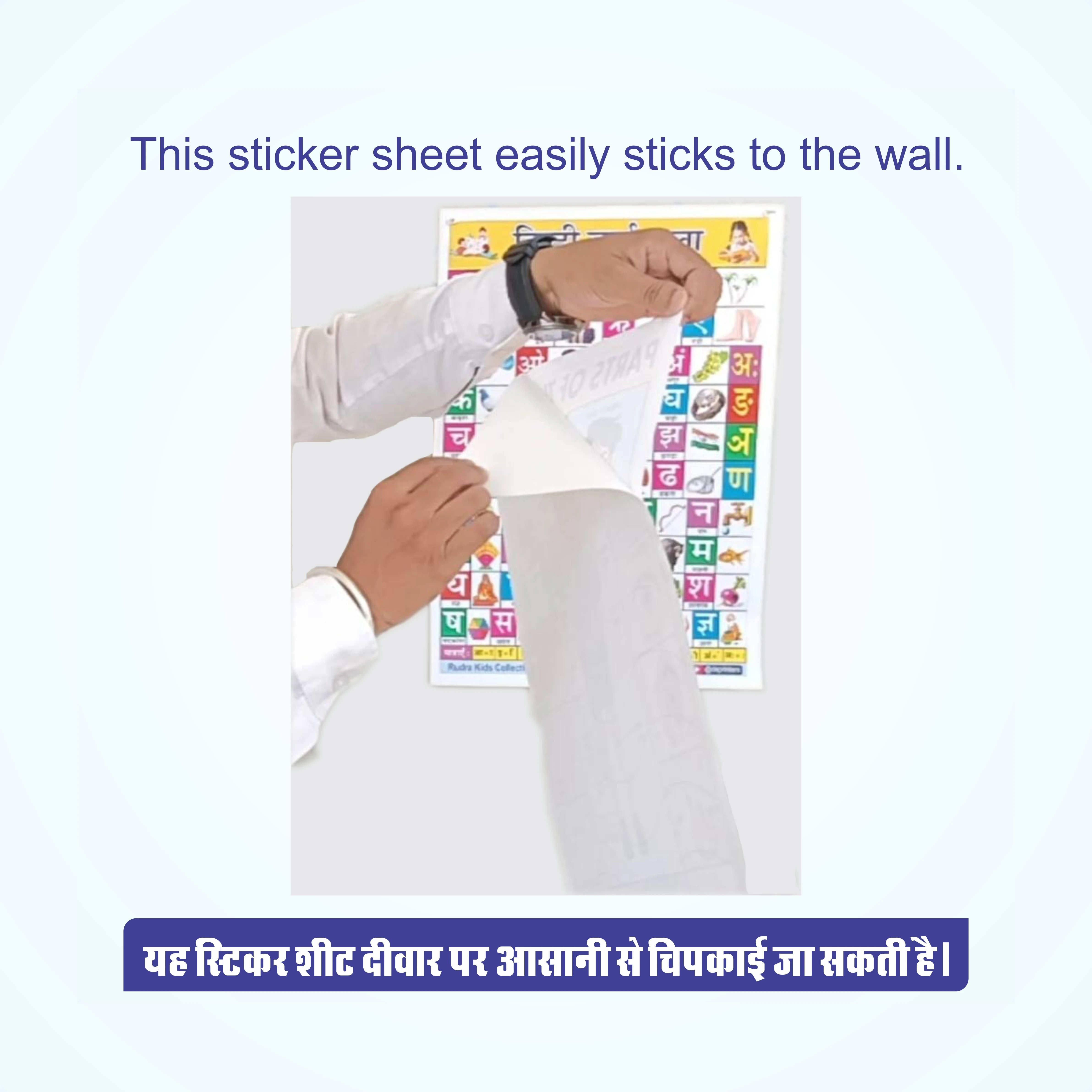 Make early education fun and interactive with the Rudra Kids Collection Educational Sticker Set. This pack of three 12x18 inch wall stickers is the perfect addition to your child’s learning environment. The Set Includes: Hindi Varnamala Chart: Displays vowels and consonants with colorful images for easy recognition. The Alphabet Chart: Features uppercase and lowercase English letters with clear object associations. Parts of the Body Chart: A detailed guide showing various body parts with their names in both English and Hindi for bilingual understanding. Constructed from premium waterproof material, these stickers are built to last and resist tearing. Whether you are decorating a nursery, a classroom, or a home study area, these vibrant posters serve as both a decorative element and a powerful teaching tool. |