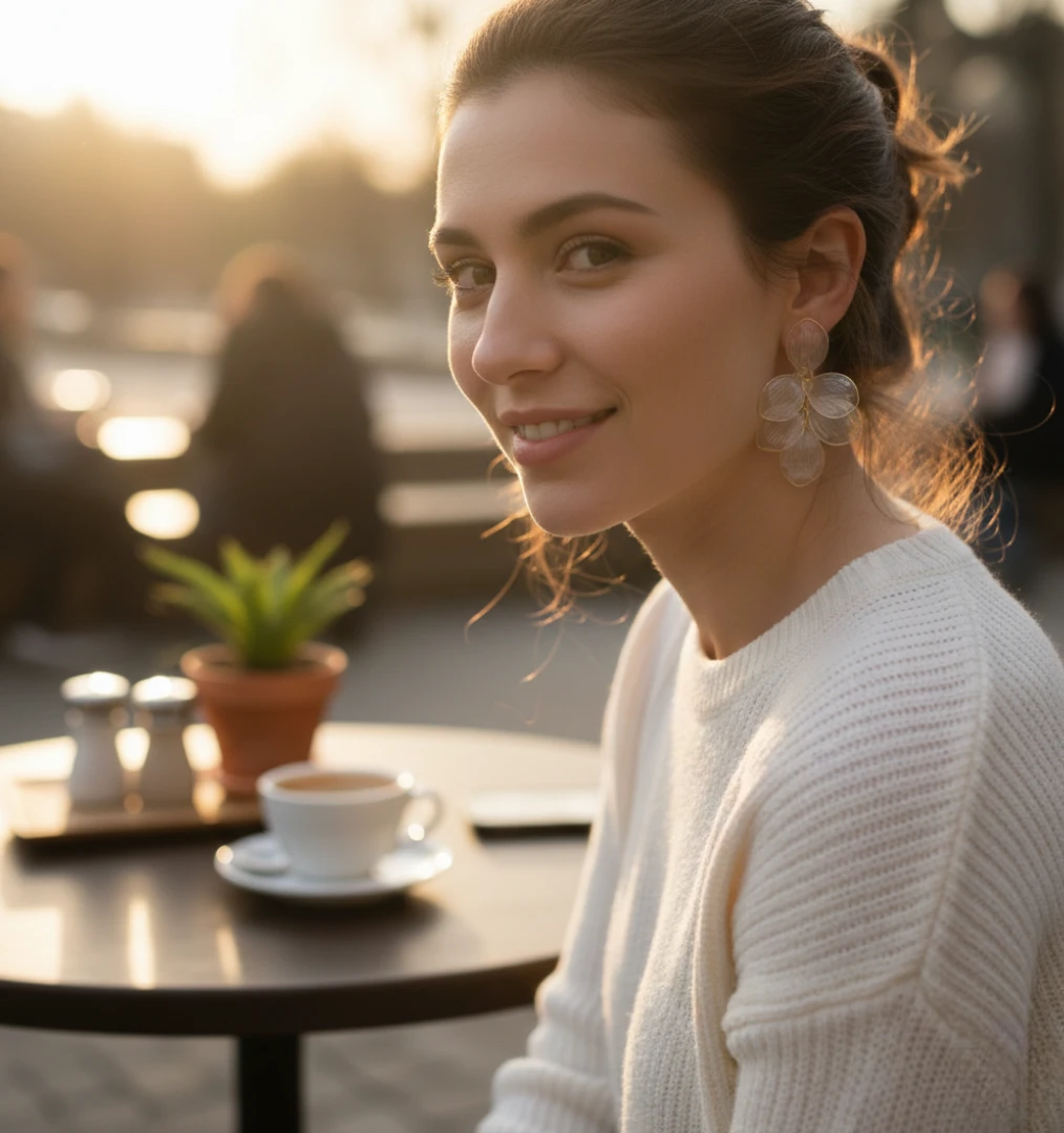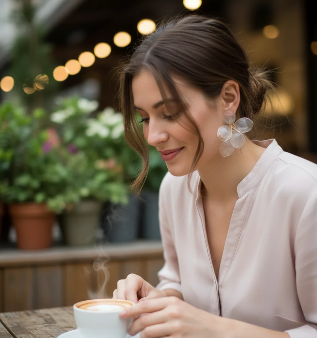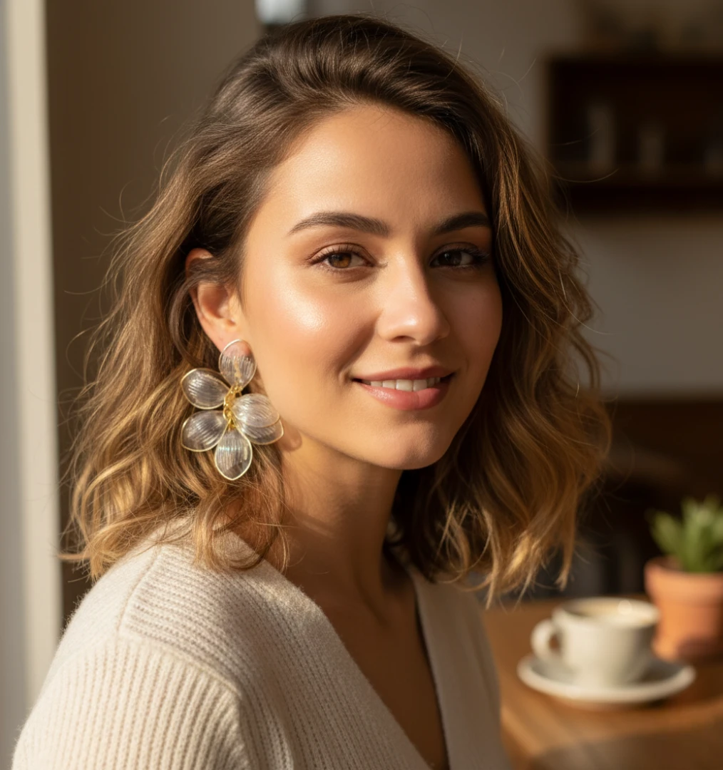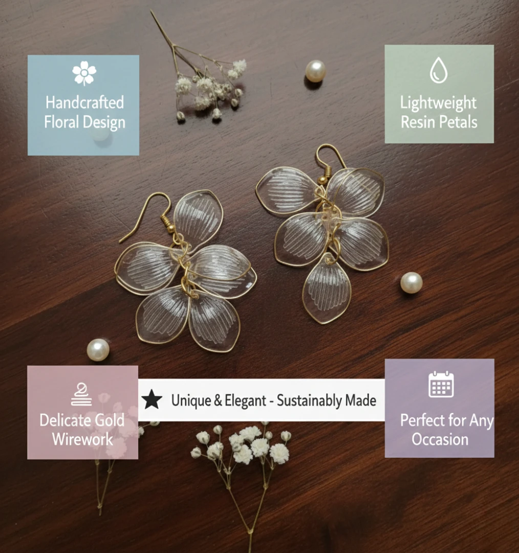Key Features Artisan Design: Each earring features multiple layered petals with a fine, ribbed texture that creates a stunning iridescent effect. Golden Elegance: The petals are delicately rimmed with gold-finished wire, suspended from classic gold-tone French hooks for a secure and comfortable fit. Versatile Style: Whether you’re dressing up for a wedding, a garden party, or adding a feminine touch to a casual outfit, these earrings offer a timeless, sophisticated charm. Lightweight Comfort: Despite their bold, floral silhouette, these earrings are exceptionally lightweight, allowing for all-day wear without fatigue. Specifications Material: High-quality translucent resin/acrylic, gold-toned alloy wire. Closure: Classic French hook (Fishhook). Style: Botanical, Whimsical, Romantic. Styling Tip: Pair these with a silk slip dress or a soft linen blouse to lean into their airy, organic aesthetic. |