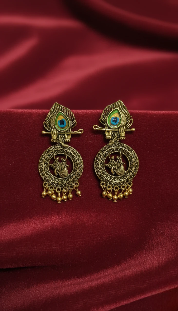 Add a divine touch to your jewelry collection with these stunning Blisskart Oxidized Silver Jhumka Earrings. These handcrafted earrings feature a beautiful spiritual design combining Lord The intricate circular drop depicts the divine Raas Leela of Radha-Krishna, finished with trendy jingling silver ghungroos at the bottom. Perfect for Navratri, weddings, festivals, or daily ethnic wear, these lightweight earrings are designed for the modern Indian woman who loves a touch of tradition. Key Features: Unique Design: Features a detailed Peacock Feather (Mor Pankh) top with a Krishna Flute and a hollow circular drop showing Radha-Krishna figures. Premium Quality: High-quality oxidized silver plating that offers a premium look and is skin-friendly (nickel-free and lead-free). Lightweight: Comfortable to wear for long hours without pain. Versatile Styling: Matches perfectly with Sarees, Kurtis, Suits, Lehengas, and Indo-western outfits. Ideal Gift: A perfect gift for birthdays, anniversaries, Rakhi, or Diwali for your sister, wife, or friend. Product Specifications: Material: Alloy / Brass Plating: Oxidized Silver Color: Silver with Blue/Green Enamel detailing Stone Type: No Stone / Ghungroo Beads Closure: Push Back Style: Jhumka |