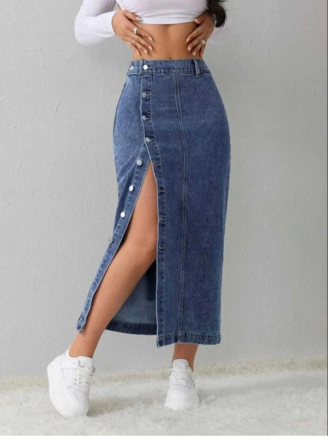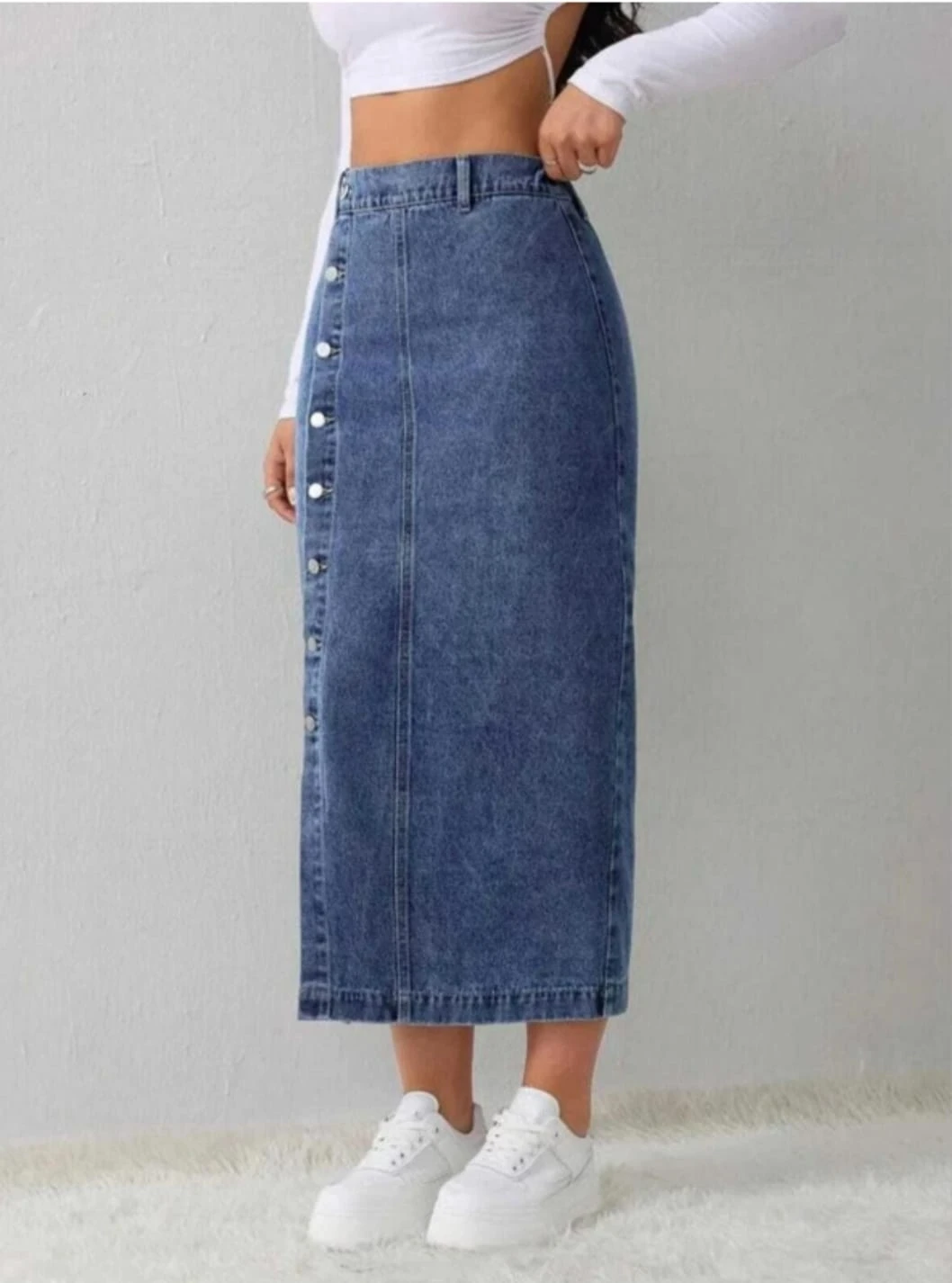Trendy blue denim midi skirt for women with high waist and button-front design. Stylish and comfortable jean skirt, perfect for casual wear, street style, and everyday fashion. • denim midi skirt women • blue jean skirt long • high waist denim skirt • button front midi skirt • casual skirts for women • long denim skirt outfit • trendy jean skirt for girls • street style denim skirt • stylish skirts for women • everyday wear skirts • Trendy Midi Length – Stylish mid-calf length skirt suitable for casual and everyday wear. • Classic Denim Fabric – Made from durable, high-quality denim for a timeless look. • High Waist Design – Flattering fit that enhances the waistline and pairs well with crop tops or tucked-in shirts. • Button-Front Detailing – Fashionable button closure with slit for easy movement and chic styling. • Versatile Styling – Perfect for casual outings, brunch, college, shopping, and street fashion. • All-Season Wear – Can be styled with crop tops in summer or layered with sweaters in winter. • Comfortable Fit – Soft denim material ensures comfort throughout the day. • Easy Care – Machine washable and low-maintenance for everyday use |