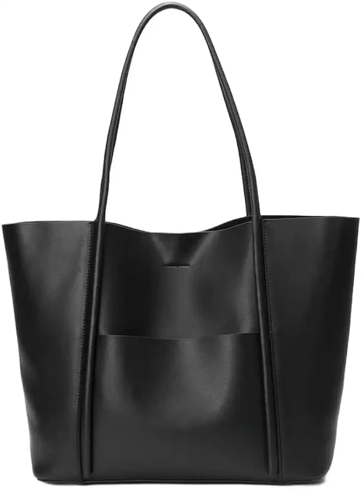 1. Material: Smooth black leather. 2. Design: Simple tote style with two shoulder straps and a rectangular shape. 3. Details: A front exterior pocket and silver-colored metal feet at the bottom to protect the bag. 4. Usage: Suitable for casual or office use, carrying everyday items. |