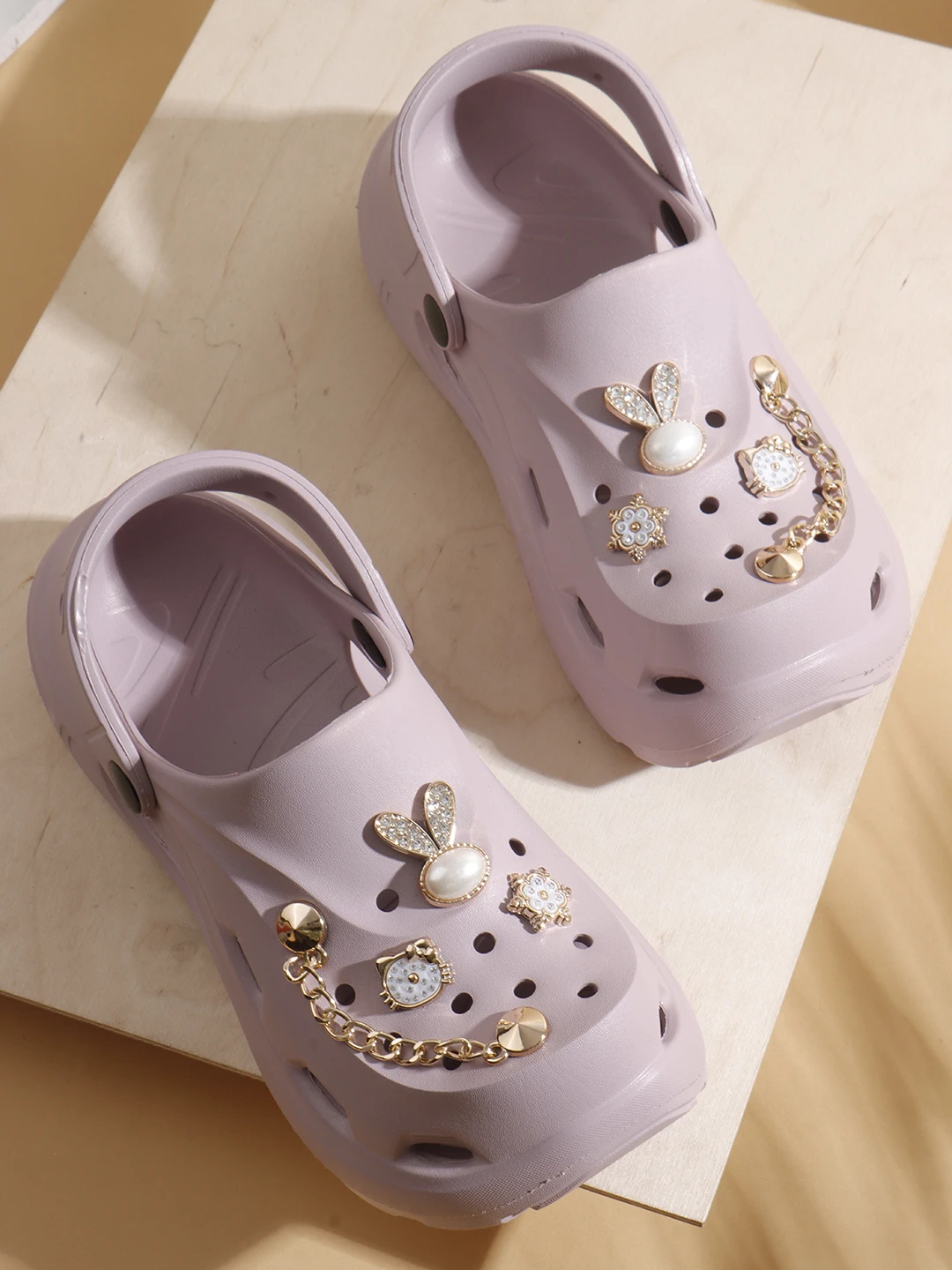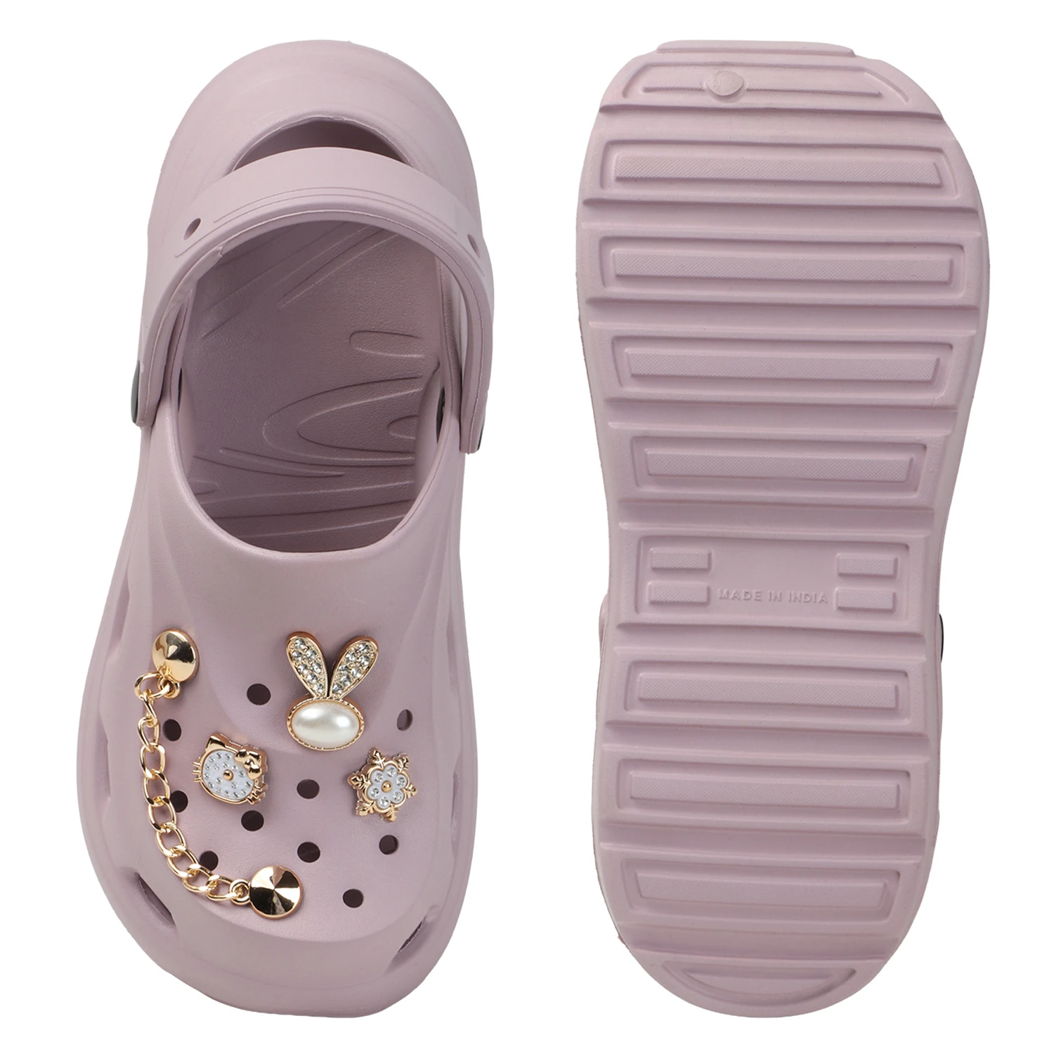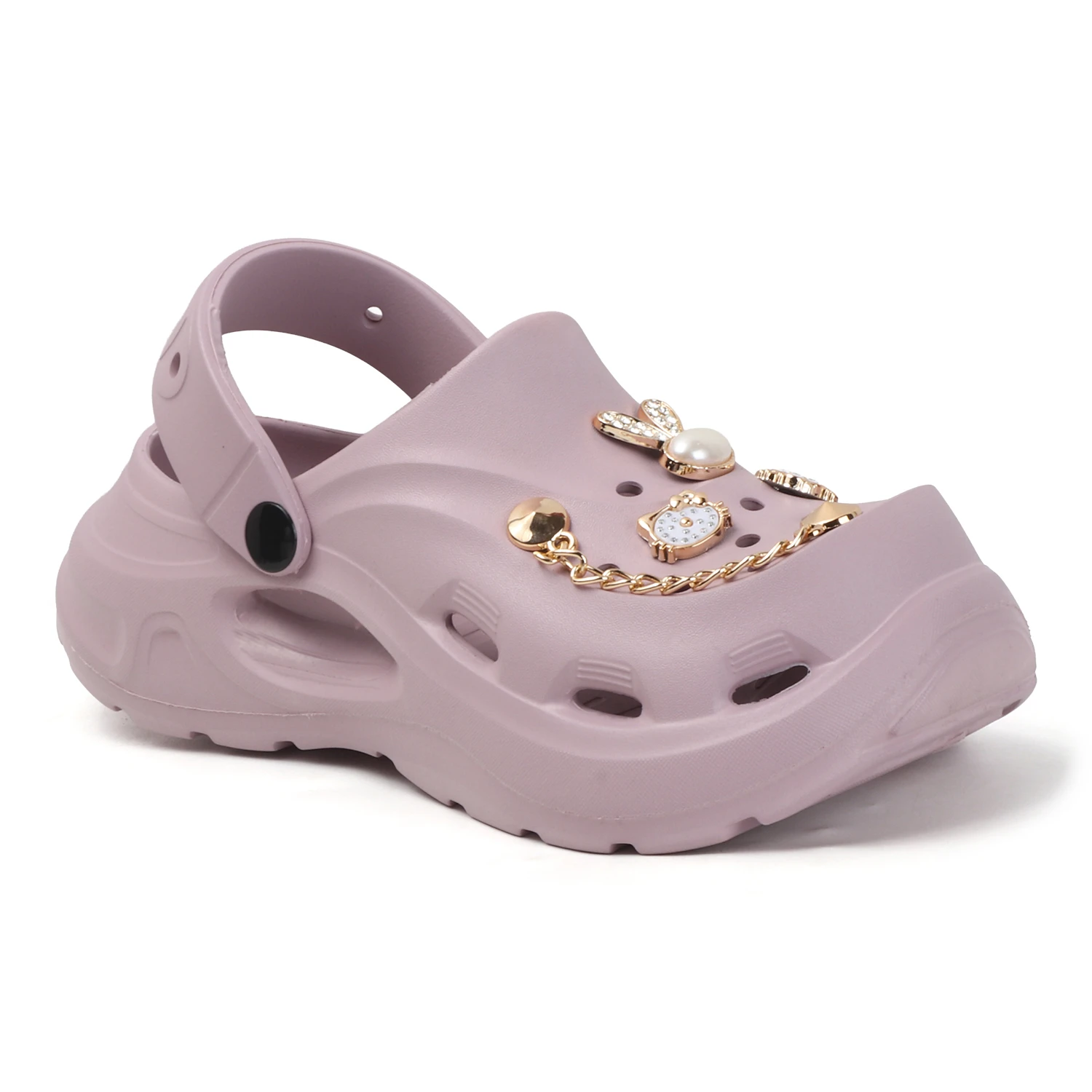 Add a fun and stylish touch to your look with these trendy women’s clogs designed for easy wear and a playful appeal. Featuring charming decorative elements on the straps, these clogs bring a cute and modern vibe to your casual outfits. The lightweight build and cushioned sole support effortless movement, while the adjustable back strap ensures a secure and stable fit. Water-resistant and simple to maintain, these clogs are ideal for casual outings, home use, or relaxed travel wear, making them a fashionable and practical choice for women. |