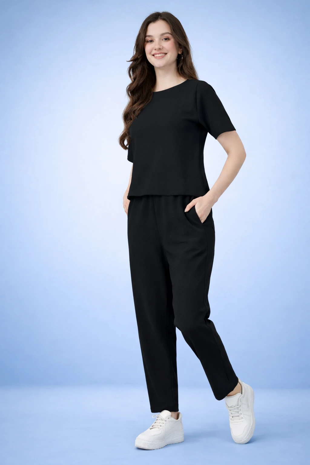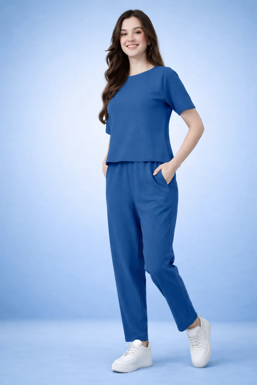 This elegant co-ord set features a perfectly balanced blend of comfort, style, and versatility, making it ideal for everyday wear as well as relaxed outings. Crafted in a rich wine-maroon shade, the set includes a short-sleeve top with a clean round neckline and a straight, flattering silhouette that drapes smoothly on the body. The matching trousers are designed with a relaxed straight fit, functional side pockets, and a comfortable waistband that allows easy movement throughout the day. Made from soft, breathable fabric, this co-ord set feels lightweight on the skin while maintaining a structured and polished look. The minimal design makes it easy to dress up with heels and accessories or keep casual with sneakers for a chic, effortless style. Perfect for travel, casual workdays, brunches, or lounging in style, this coordinated outfit is a must-have addition to any modern wardrobe.