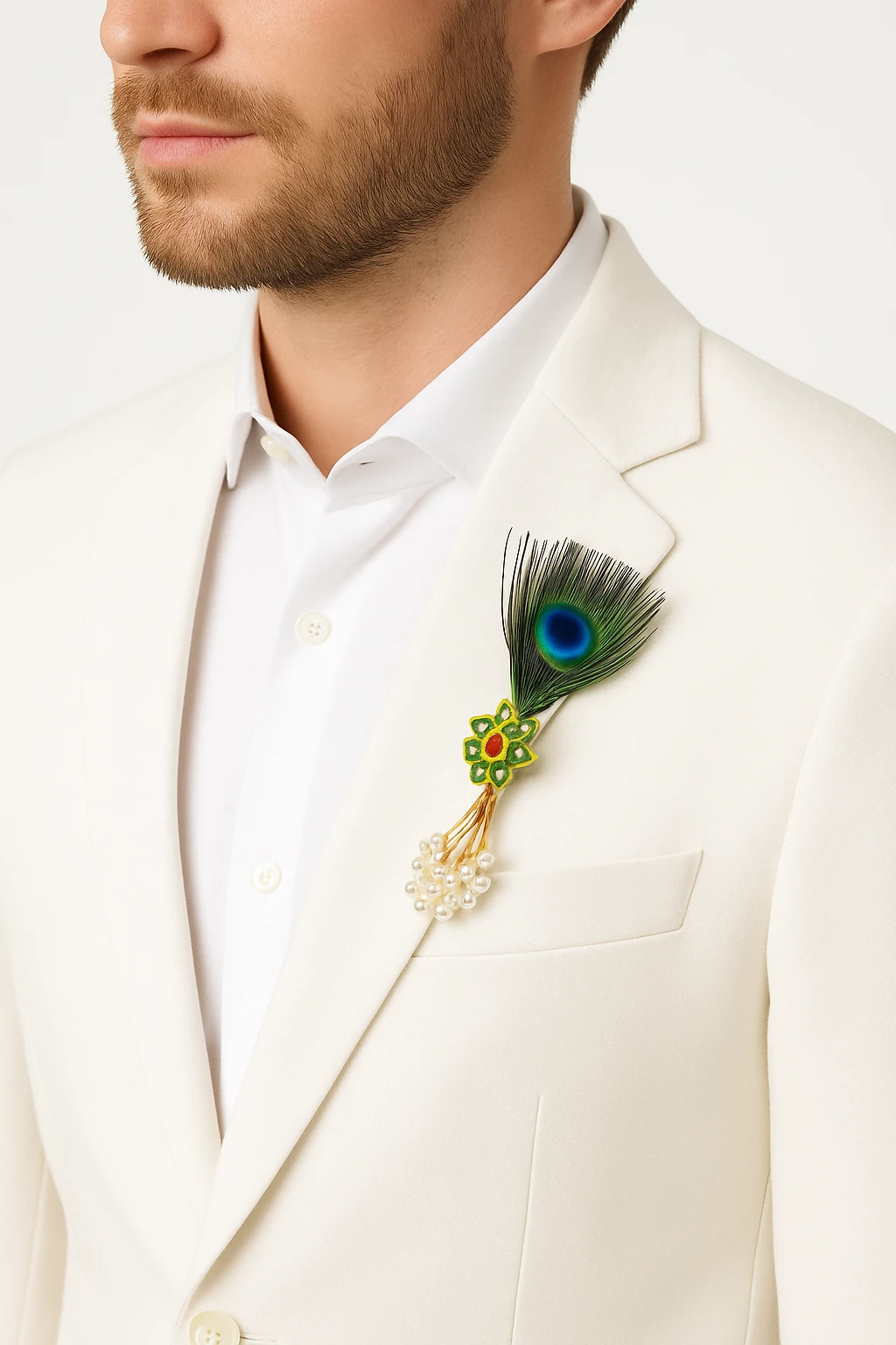 Enhance your traditional and formal outfits with this Elegant Peacock Feather Krishna Brooch Pin, a stylish accessory inspired by classic Indian royal fashion. Featuring a beautifully crafted gold-plated floral design with sparkling crystal stones and a vibrant center gem, the brooch is paired with a natural-style peacock feather that adds a distinctive and graceful touch. Perfect for sherwanis, bandhgalas, blazers, suits, and wedding attire, this brooch instantly elevates your look for weddings, festive celebrations, cultural events, and special occasions. The long stick pin design ensures secure and easy attachment while maintaining a refined, elegant appearance.