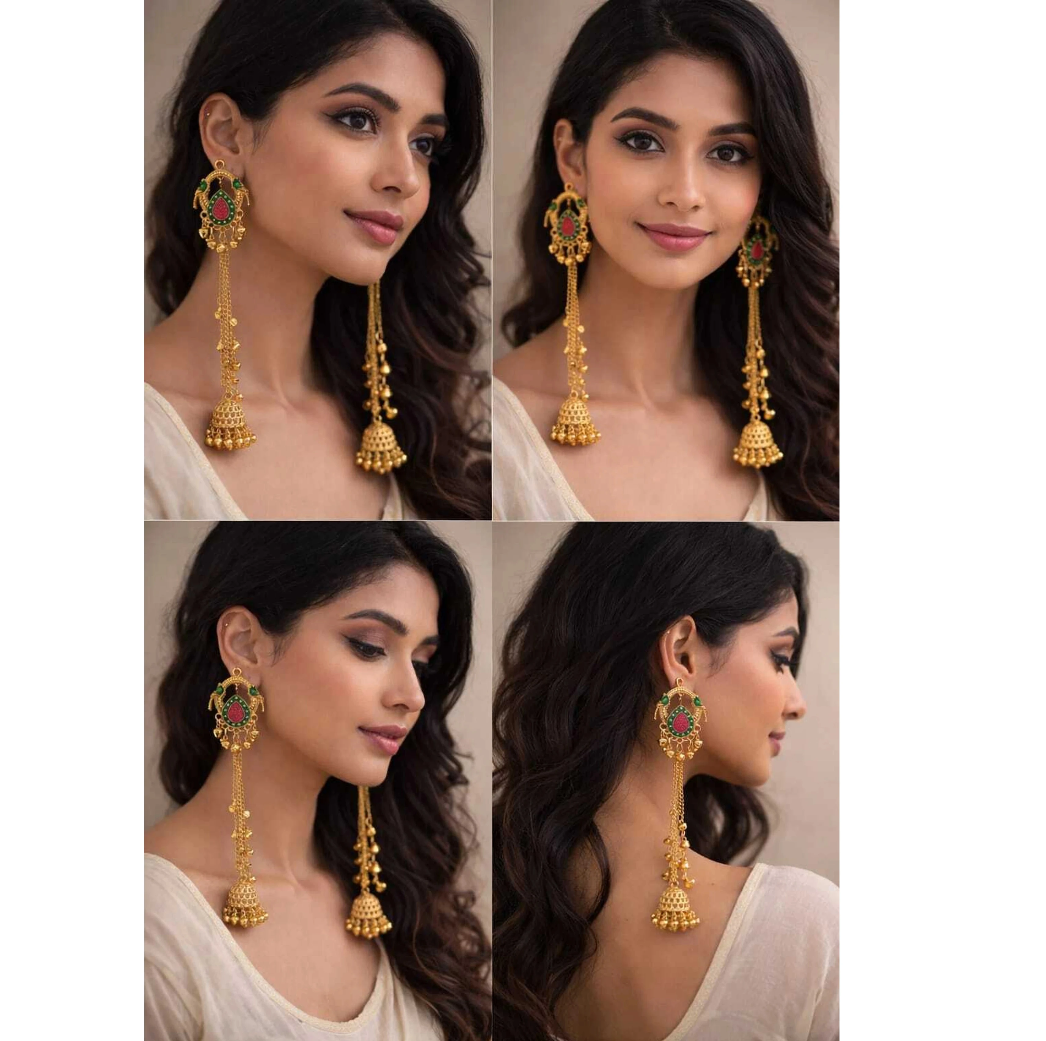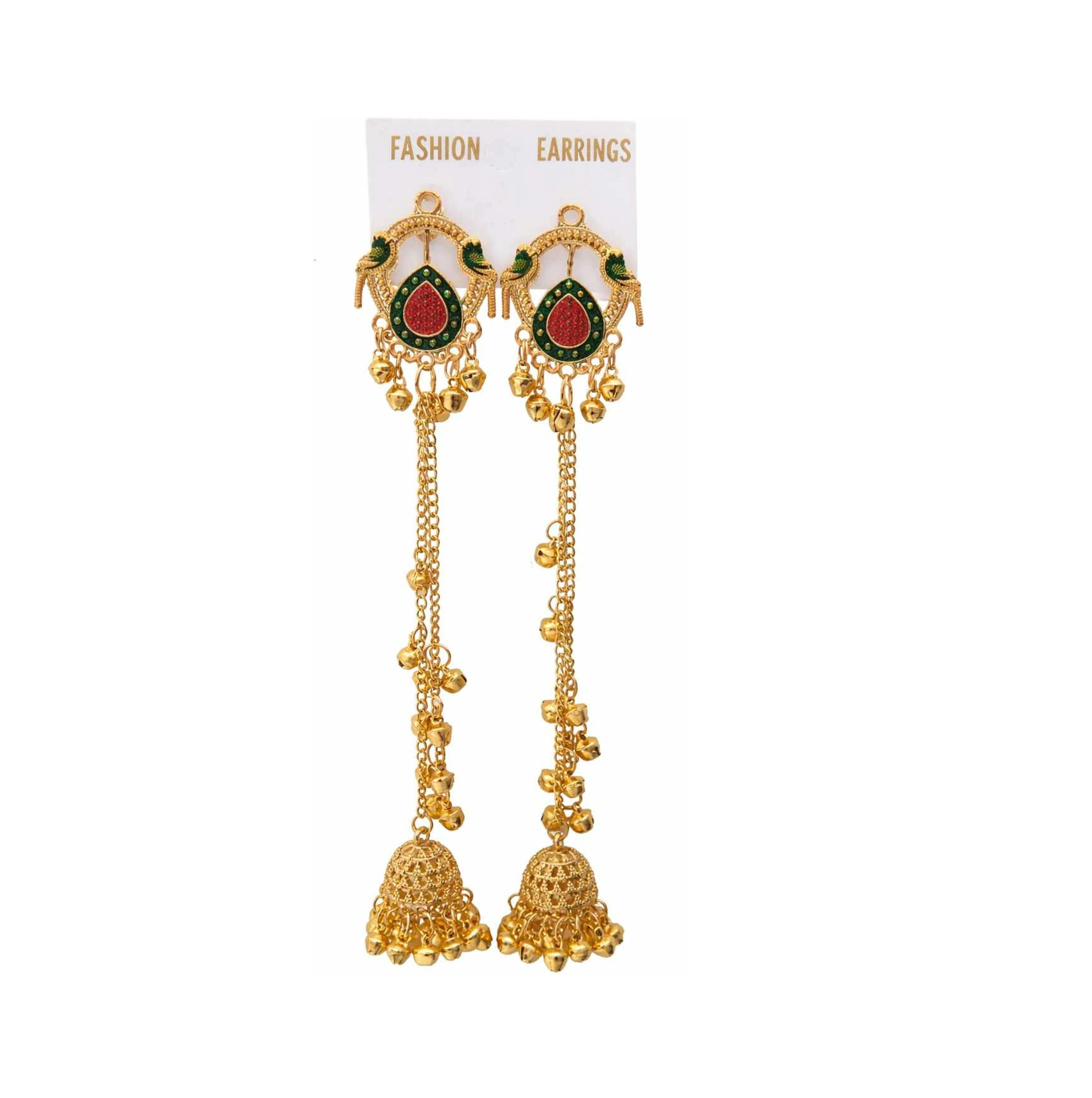 These handcrafted gold-plated Jhumkas from Famepixel are a stunning tribute to Kashmiri artistry, blending traditional heritage with modern elegance. Each piece features an ornate circular stud embellished with delicate stonework and gold-beaded borders, from which flow three graceful, cascading chains. These long chains are punctuated by polished gold spheres and culminate in intricate, bell-shaped jhumkas, creating a "Dejhoor-inspired" silhouette that offers beautiful movement. Perfect as a modern heirloom, Famepixel's earrings are designed to "Embrace Timelessness," making them a sophisticated statement piece for weddings, festivals, or high-fashion occasions. |