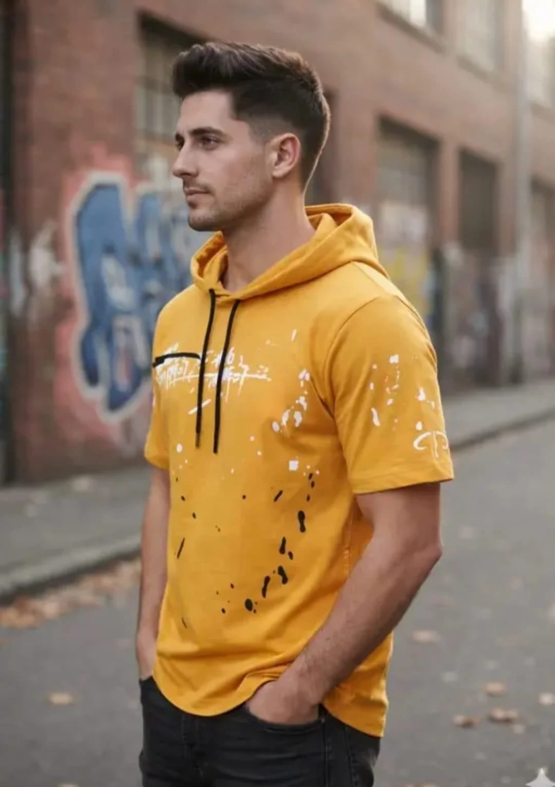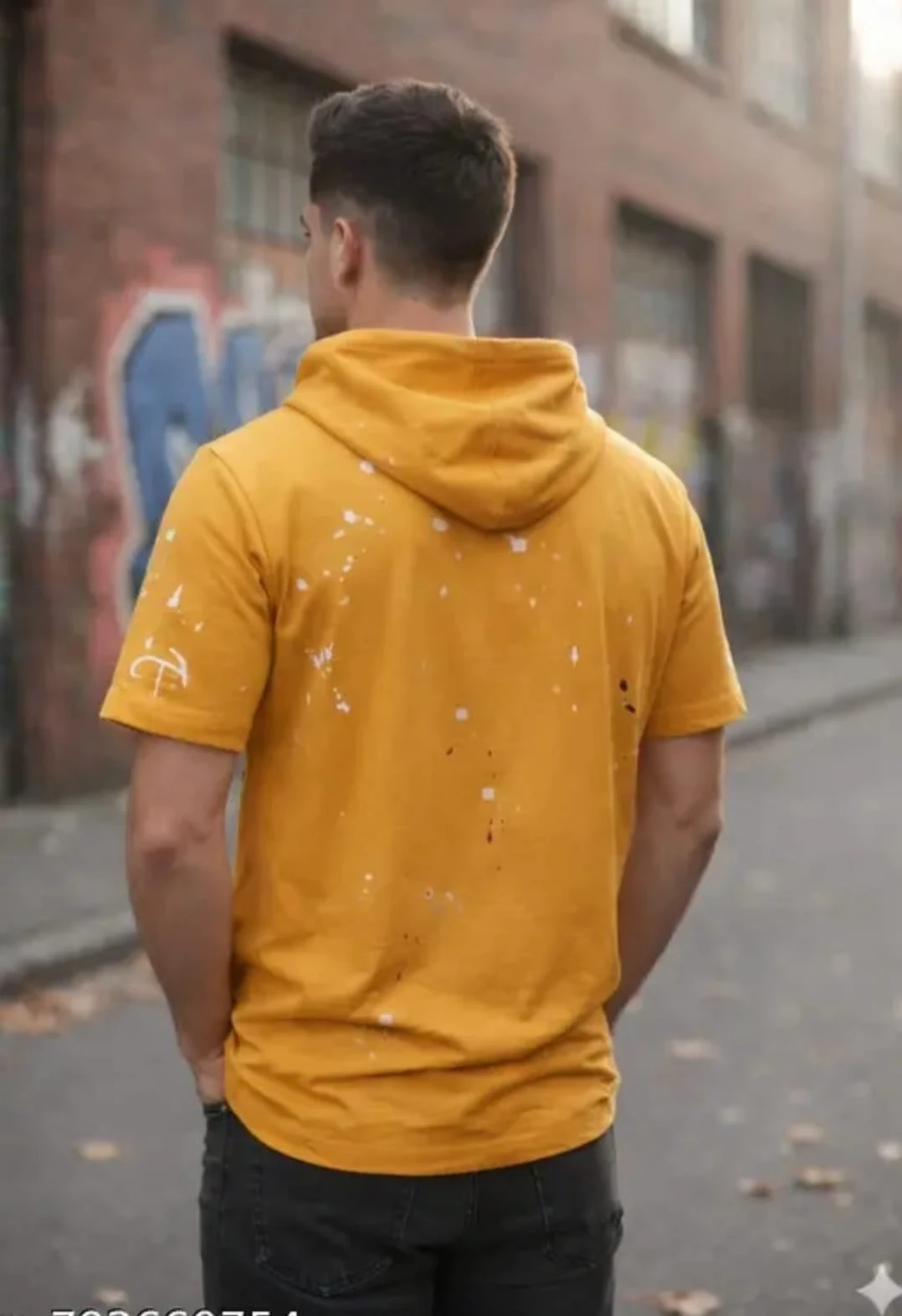THIS IS GENTS HOOD T-SHIRT AVAILABLE IN GOOD QUALITY OF FABRIC WHICH IS BEST FOR SUMMERS AND THE COLOUR WHICH IS YELLOW GIVES AMAZING LOOK |
