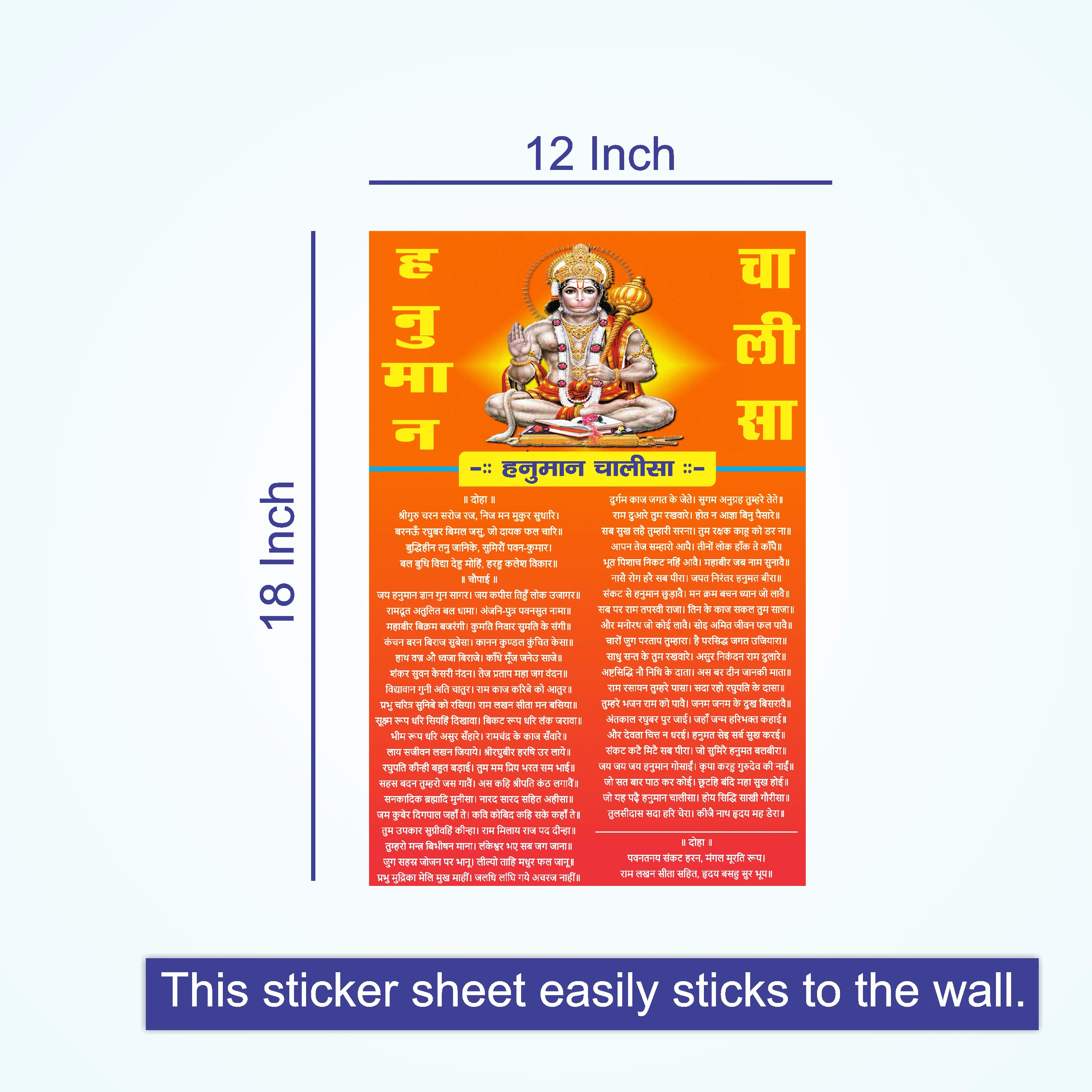 Bring divine blessings to your home with this beautifully designed Hanuman Chalisa Wall Poster. Printed on a high-quality adhesive sticker sheet, this 12x18 inch poster is perfect for walls, doors, pooja rooms, shops, or offices. The full Hanuman Chalisa is clearly printed in Hindi with vibrant devotional artwork that enhances the spiritual feel of your space. Made from premium material, this self-adhesive poster sticks easily on any smooth surface like wood, glass, metal, or tiles. A must-have for every Hanuman devotee, it’s ideal for daily prayer or meditation. A perfect gifting choice for religious occasions, housewarmings, or spiritual celebrations. |