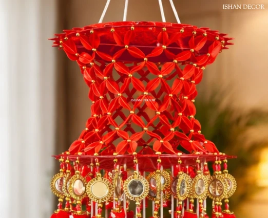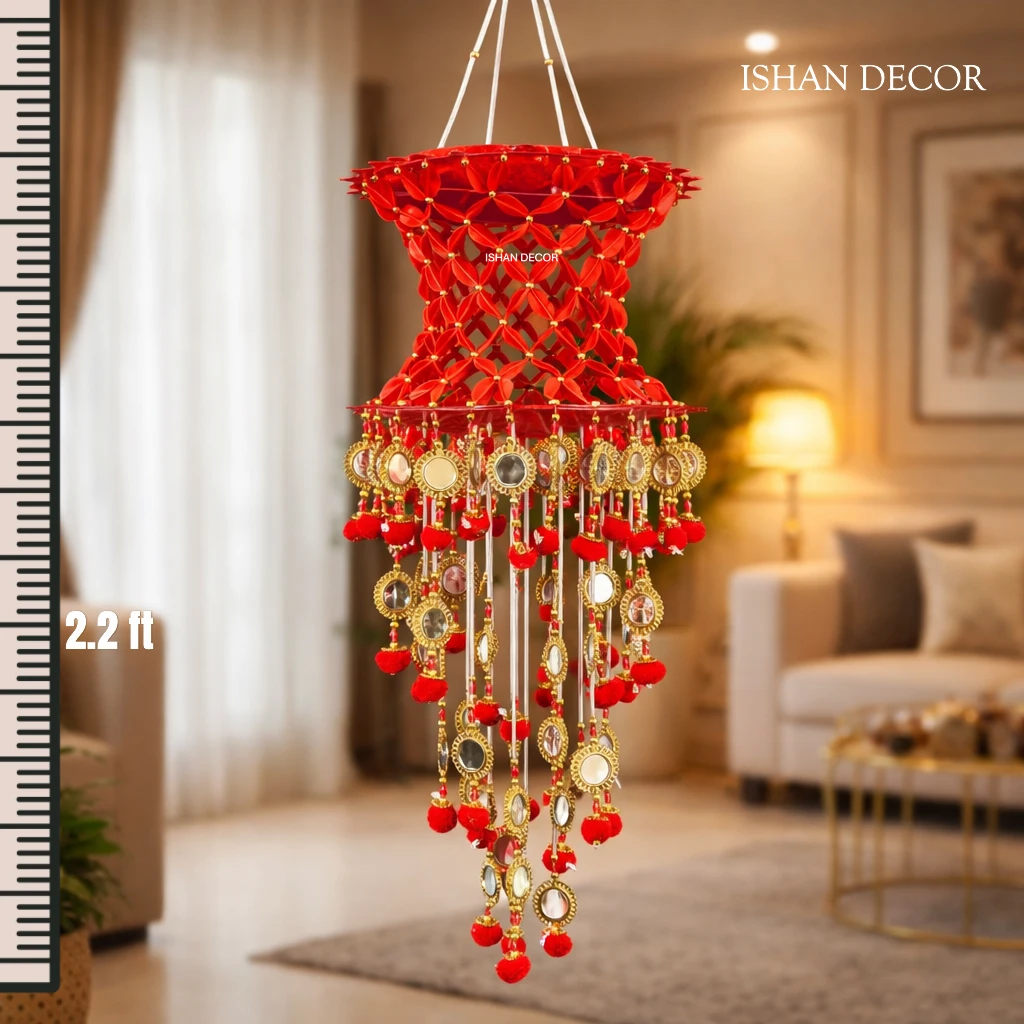 Add a Touch of Royal Elegance to Your Home Enhance your festive decor with the ISHAN DECOR Handcrafted Red Mirror Work Jhoomar. This stunning piece is a masterpiece of traditional Indian craftsmanship, designed to bring warmth and a royal aesthetic to your living space. Featuring a rich crimson red hue paired with sparkling gold accents and glass mirrors, it is the perfect statement piece for any traditional celebration. |