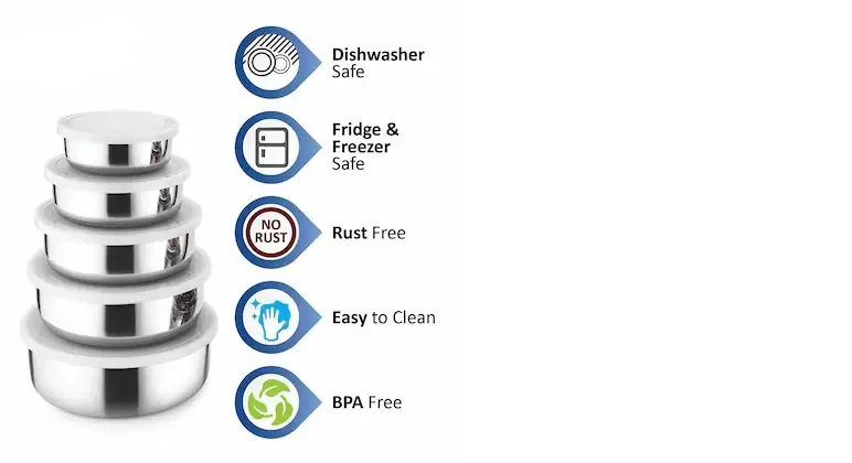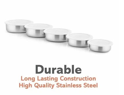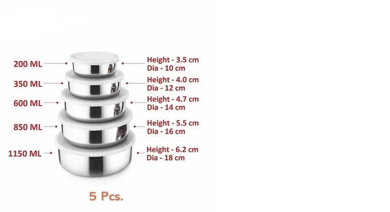 Sales Package 5PCS BOWLS + 5PCS COVERS Model Number Stainless Steel 5Pcs Lid Bowl Set with Natural White Color Lids Net Quantity 5 The lids come in different colors & are made of plastic that ensures to keep your food protected from dirt and moist. Product Dim. (Canister Set) :Product Dim. : 1 Pc XX-Large- 18x18x6.2 cm - 1150 ml , 1 Pc X-Large- 16x16x5.5 cm - 850 ml , 1 Pc Large : 14x14x4.7 cm - 600 ml , 1 Pc Medium : 12x12x4 cm - 350 ml , 1 Pc Small : 10x10x3.5 cm 200 ml its in unique design, the stainless steel Canisters are space saver. Available in a different set Canisters with capacities a wide variety of purposes. They come in a compact design and consume less space.Canisters are dishwasher-safe. |