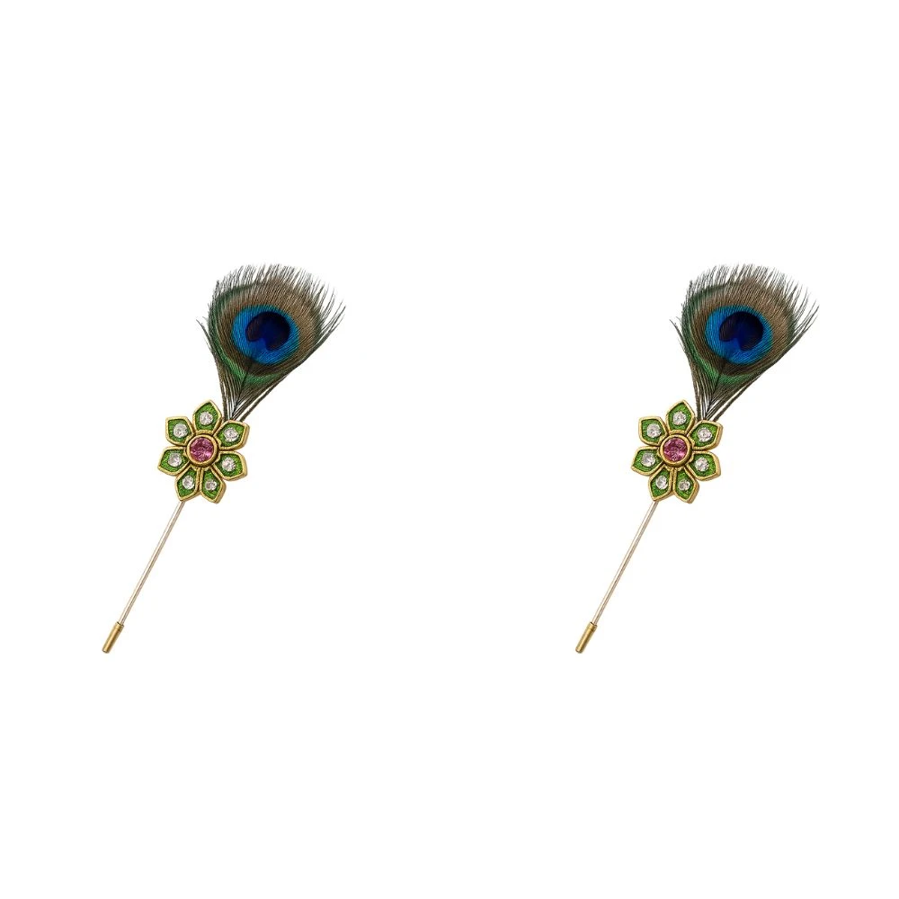 Add a touch of traditional elegance to your outfit with this Krishna Peacock Feather Brooch Pin Combo (Pack of 2). Designed with a beautiful gold-plated floral base adorned with sparkling crystal stones and a vibrant center gem, each brooch is enhanced with a natural-style peacock feather, symbolizing grace and cultural heritage inspired by Lord Krishna. These stylish stick lapel pins are perfect for sherwanis, bandhgalas, suits, blazers, and ethnic jackets, making them an ideal accessory for weddings, festive celebrations, cultural events, and special occasions. The long pin design ensures secure attachment and comfortable wear, while the premium finish adds a luxurious touch to your attire.
