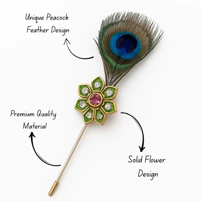 Enhance your traditional and festive outfits with this Krishna Peacock Feather Brooch Pin Combo (Pack of 3), designed to bring royal elegance to your attire. Each brooch features a beautiful gold-plated floral design embellished with sparkling crystal stones and a vibrant center gem, paired with a natural-style peacock feather inspired by the iconic symbol associated with Lord Krishna. These stylish stick lapel pins are perfect for sherwanis, bandhgalas, suits, blazers, and ethnic jackets, making them ideal for weddings, cultural events, festive celebrations, and special occasions. The slim stick-pin design ensures secure attachment while maintaining a sophisticated look.