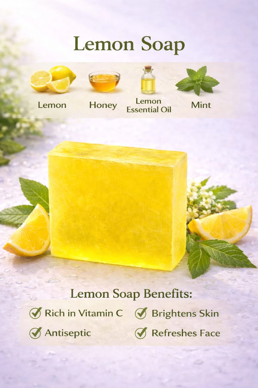 Lemon Soap Pack Of 3 Type: Bar Flavour: Lemon Net Quantity (N): 3 your skincare routine with the energizing goodness of Lemon Soap. Infused with lemon extracts, this soap gently cleanses the skin while helping remove excess oil and impurities. Its refreshing citrus fragrance instantly uplifts your mood, leaving your skin feeling clean, fresh, and revitalized after every wash. Suitable for daily use, Lemon Soap is perfect for those who love a fresh, bright, and clean skin feel. ✔ Controls excess oil & shine ✔ Helps reduce acne & pimples ✔ Brightens and refreshes skin tone ✔ Natural citrus fragrance for freshness ✔ Removes dirt & pollution from pores ✔ Suitable for daily use ✔ Ideal for oily & combination skin ✔ Deep cleans skin impurities Country of Origin: India |