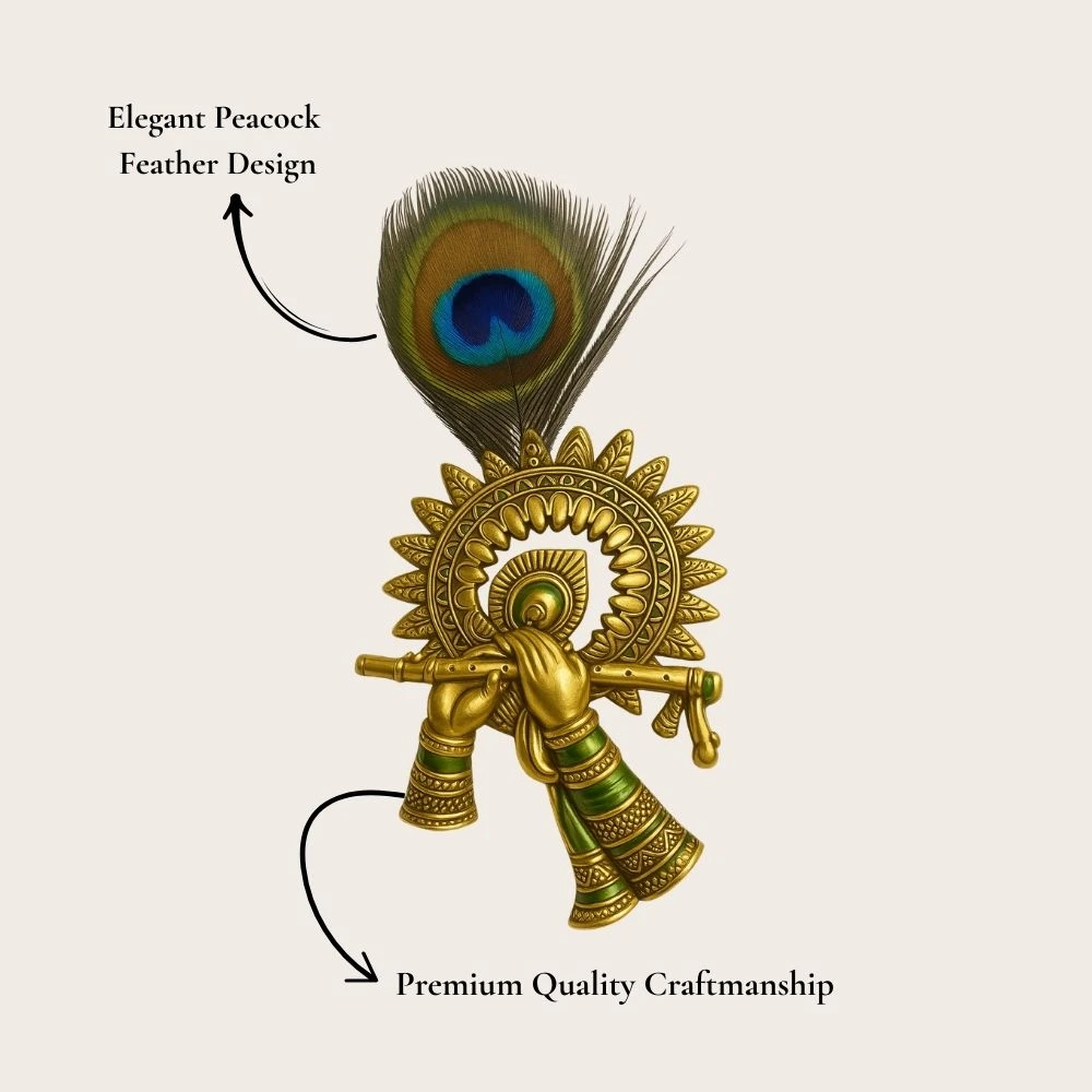 Bring divine charm and spiritual elegance to your home with this beautifully designed Lord Krishna Flute with Peacock Feather Wall Decor. Inspired by the iconic image of Krishna playing the Bansuri, this decorative piece features intricately crafted golden hands holding a flute, adorned with a vibrant peacock feather, symbolizing beauty, grace, and devotion. Perfect for home temples, pooja rooms, living rooms, meditation spaces, or spiritual corners, this wall decor adds a sacred and artistic touch to any interior. The detailed craftsmanship and antique golden finish give it a traditional yet premium look, making it an ideal gift for housewarming, festivals, Janmashtami, Diwali, or religious occasions.