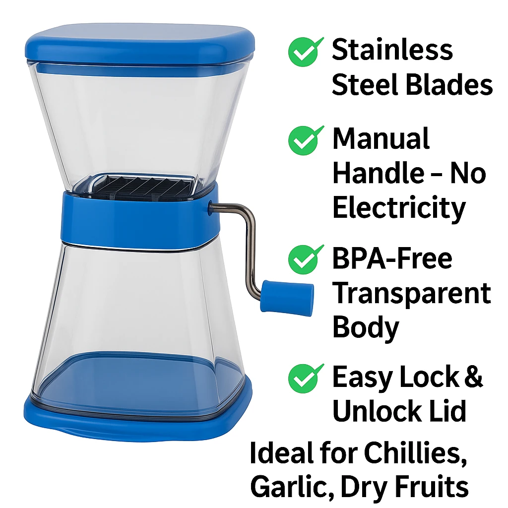 Description: The top container securely holds the ingredients, while the built-in grinding mechanism delivers consistent results. The lower storage container neatly collects the ground material, keeping your kitchen mess-free. Its compact and modern design fits perfectly in any kitchen setup. Key Features: