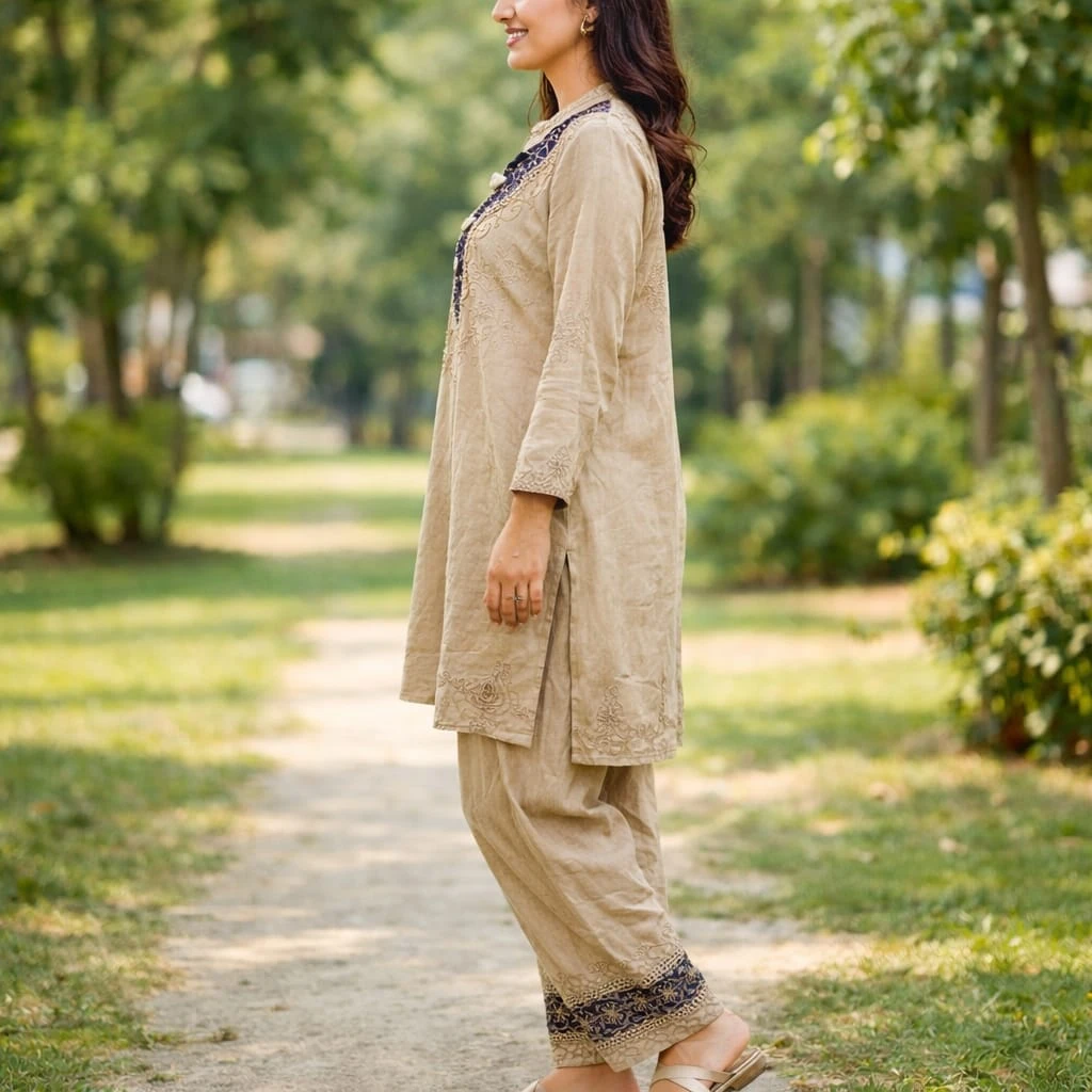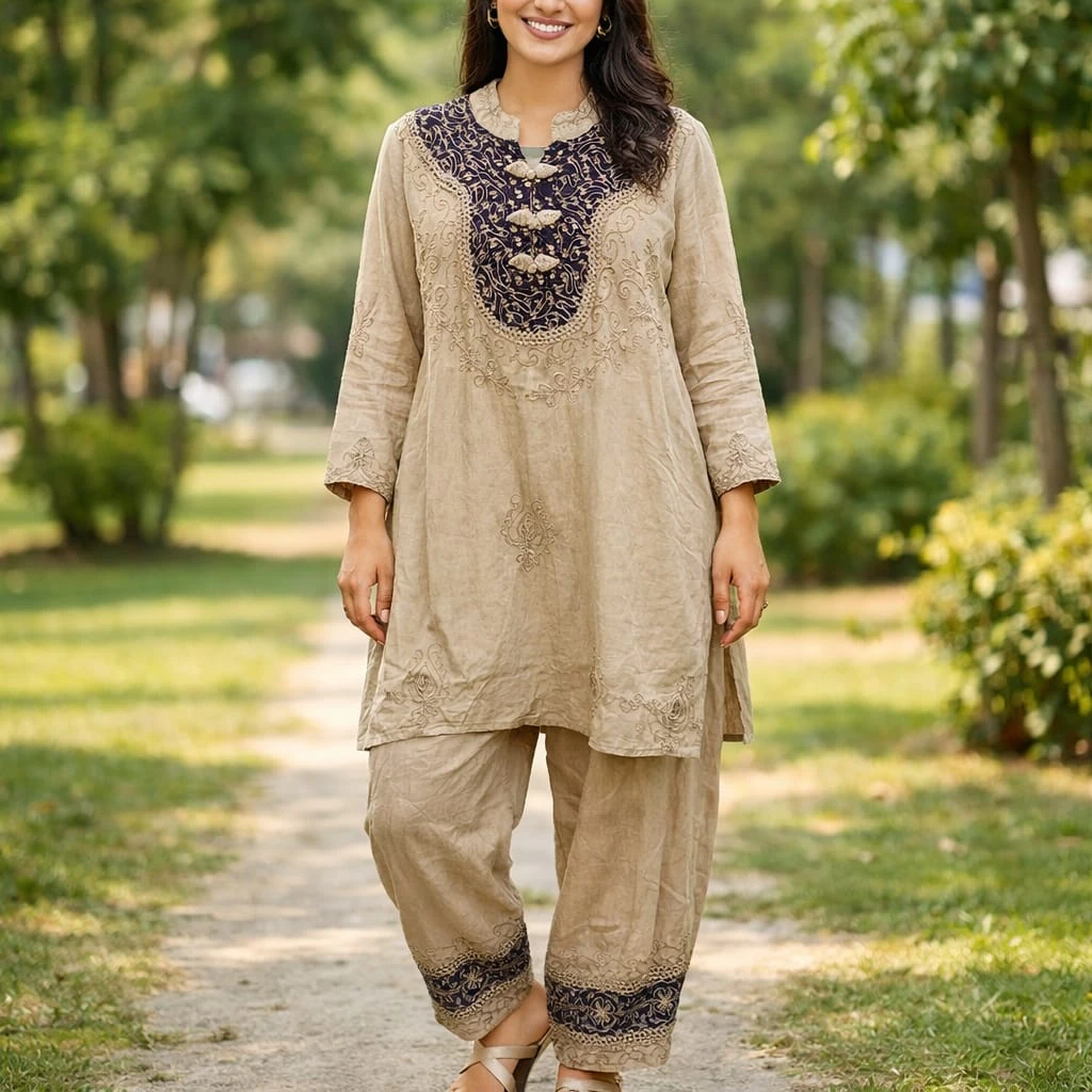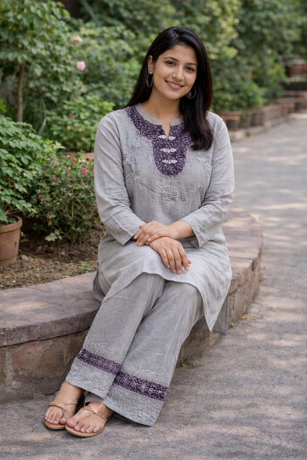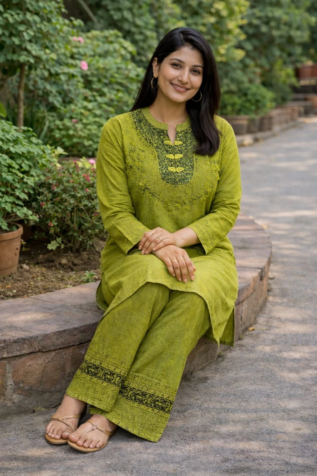 -Upgrade your everyday ethnic style with this elegankurta and pant set, designed for comfort and effortless charm. Crafted from soft, breathable fabric, this outfit features a straight-cut kurta adorned with intricate thread embroidery on the neckline and scattered motifs for a subtle yet graceful look. The 3/4th sleeves and round neck with a slit add a modern touch to the traditional silhouette. Paired with matching straight-fit pants, highlighted with coordinated embroidered detailing at the hem, this set creates a cohesive and polished appearance. Perfect for casual outings, office wear, or small gatherings, this outfit blends simplicity with sophistication. |