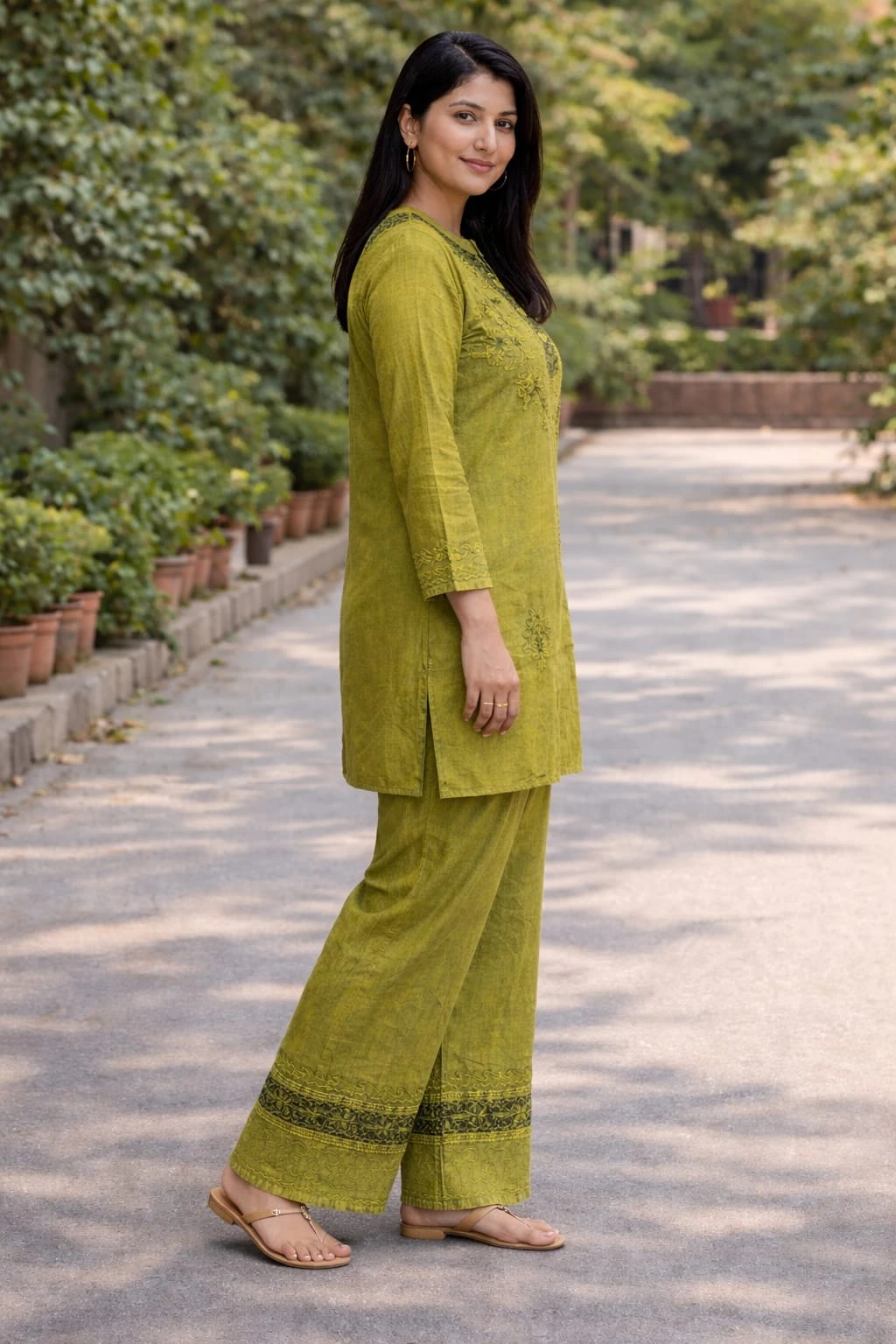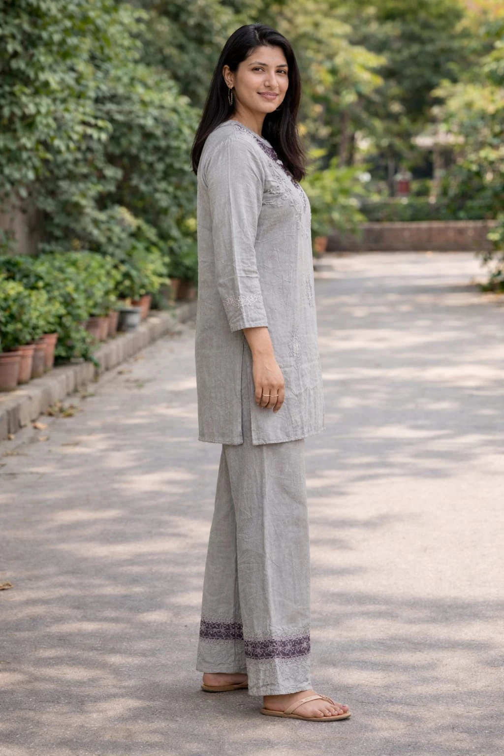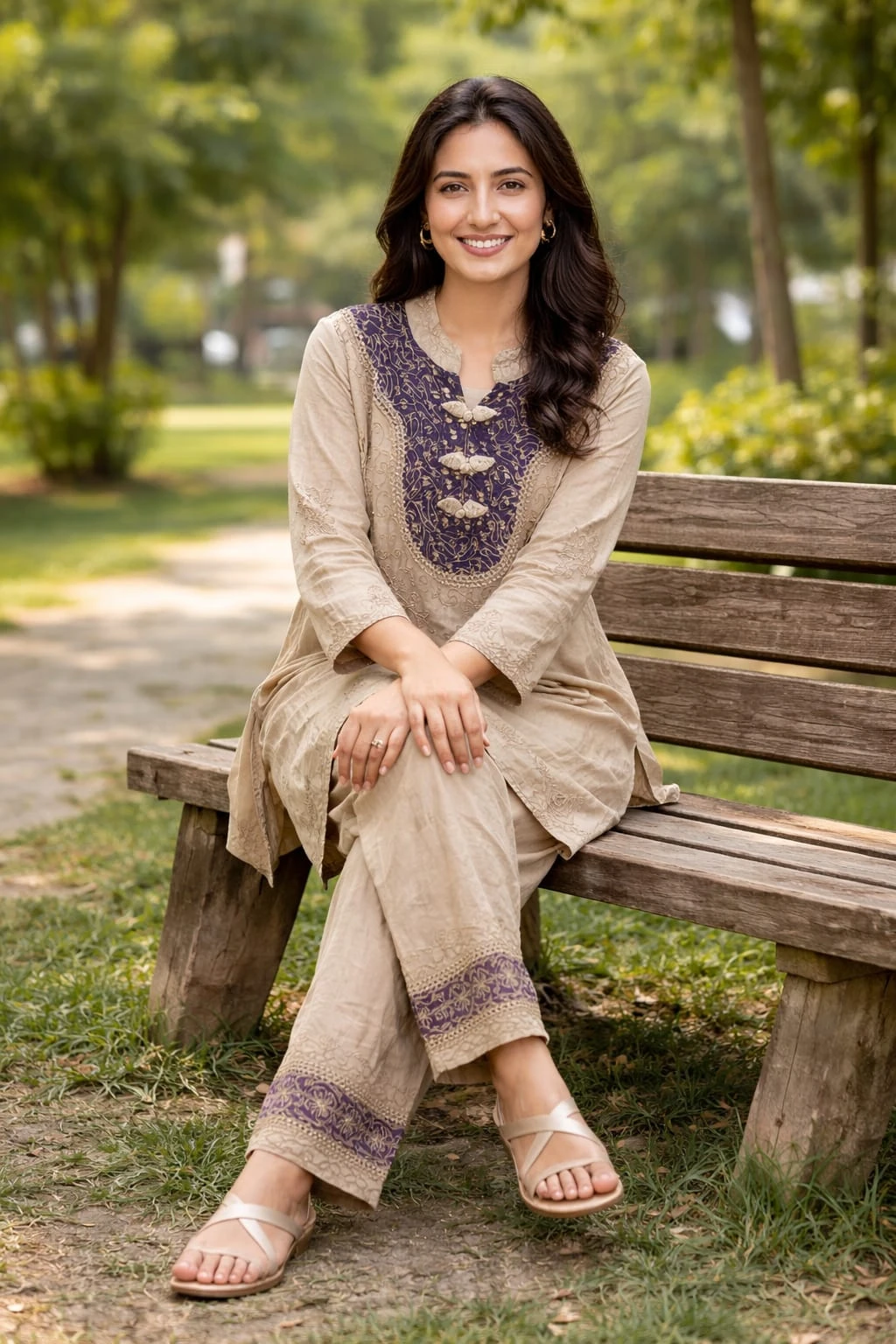 -Upgrade your everyday ethnic style with this elegankurta and pant set, designed for comfort and effortless charm. Crafted from soft, breathable fabric, this outfit features a straight-cut kurta adorned with intricate thread embroidery on the neckline and scattered motifs for a subtle yet graceful look. The 3/4th sleeves and round neck with a slit add a modern touch to the traditional silhouette. Paired with matching straight-fit pants, highlighted with coordinated embroidered detailing at the hem, this set creates a cohesive and polished appearance. Perfect for casual outings, office wear, or small gatherings, this outfit blends simplicity with sophistication. |