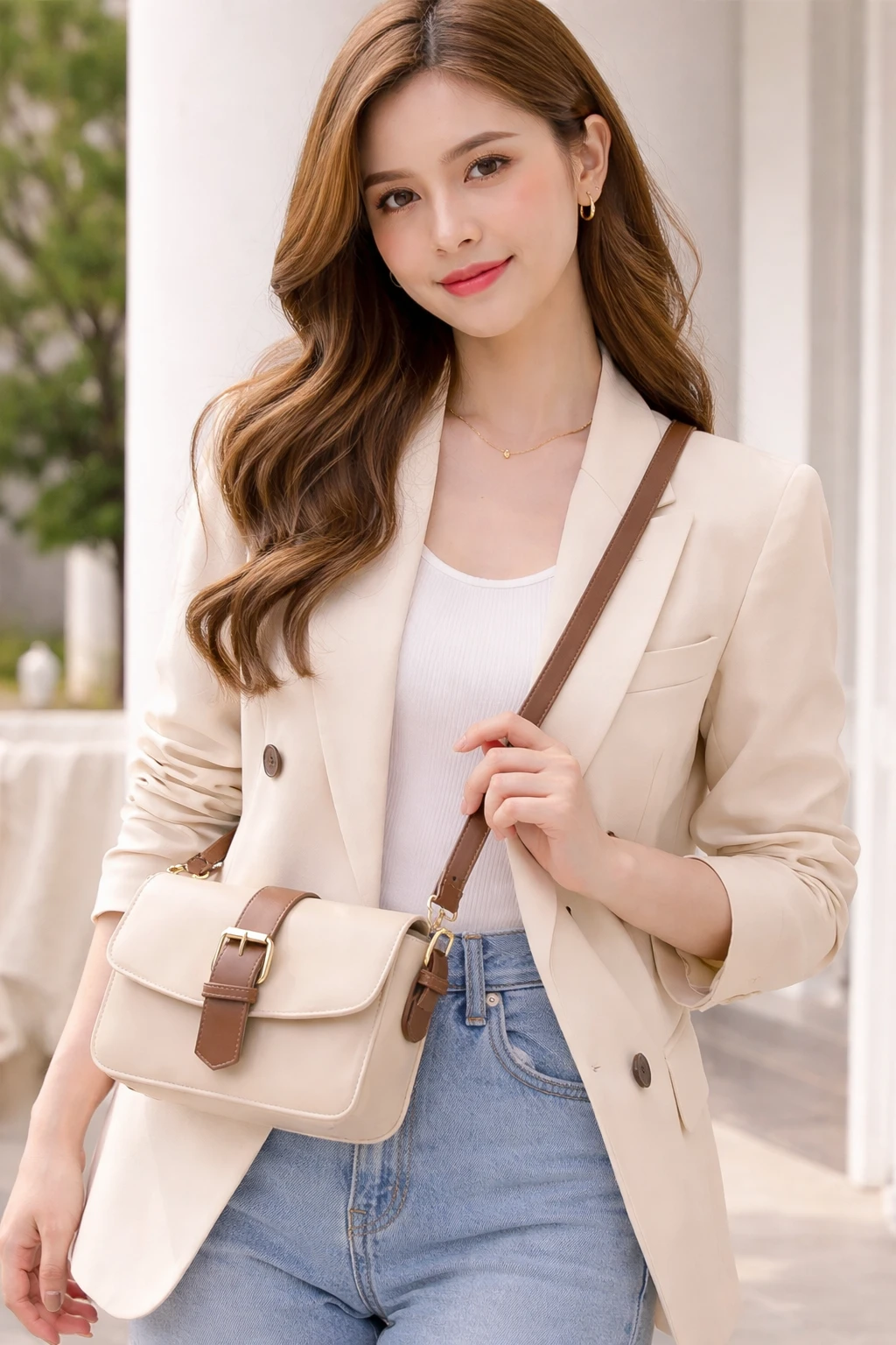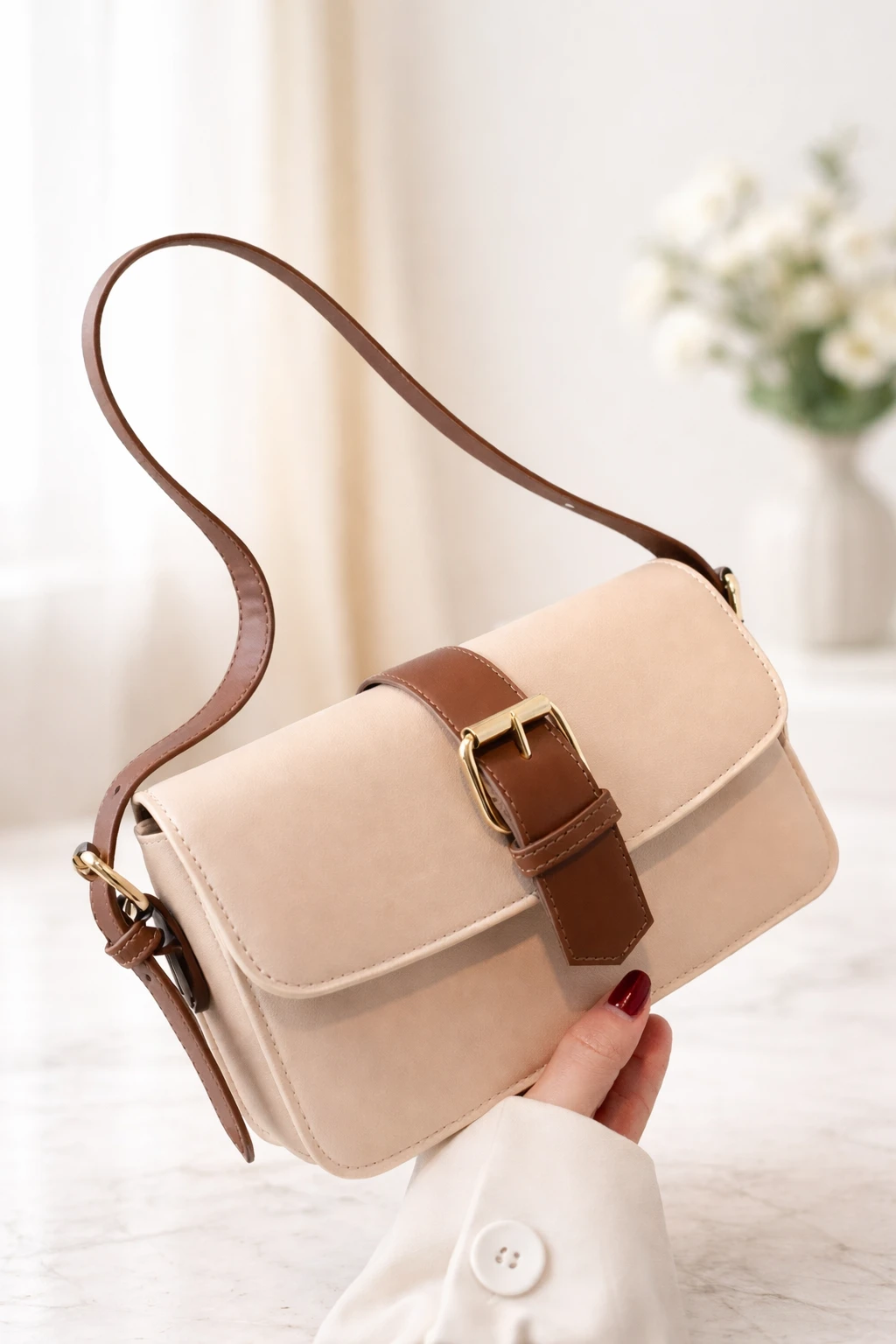 Upgrade your everyday style with this Timeless Elegance Buckle Crossbody Sling Bag, designed to add a touch of sophistication to any outfit. Crafted from high-quality material, this bag features a smooth beige finish paired with a contrasting brown strap and a stylish buckle closure that enhances its premium look.