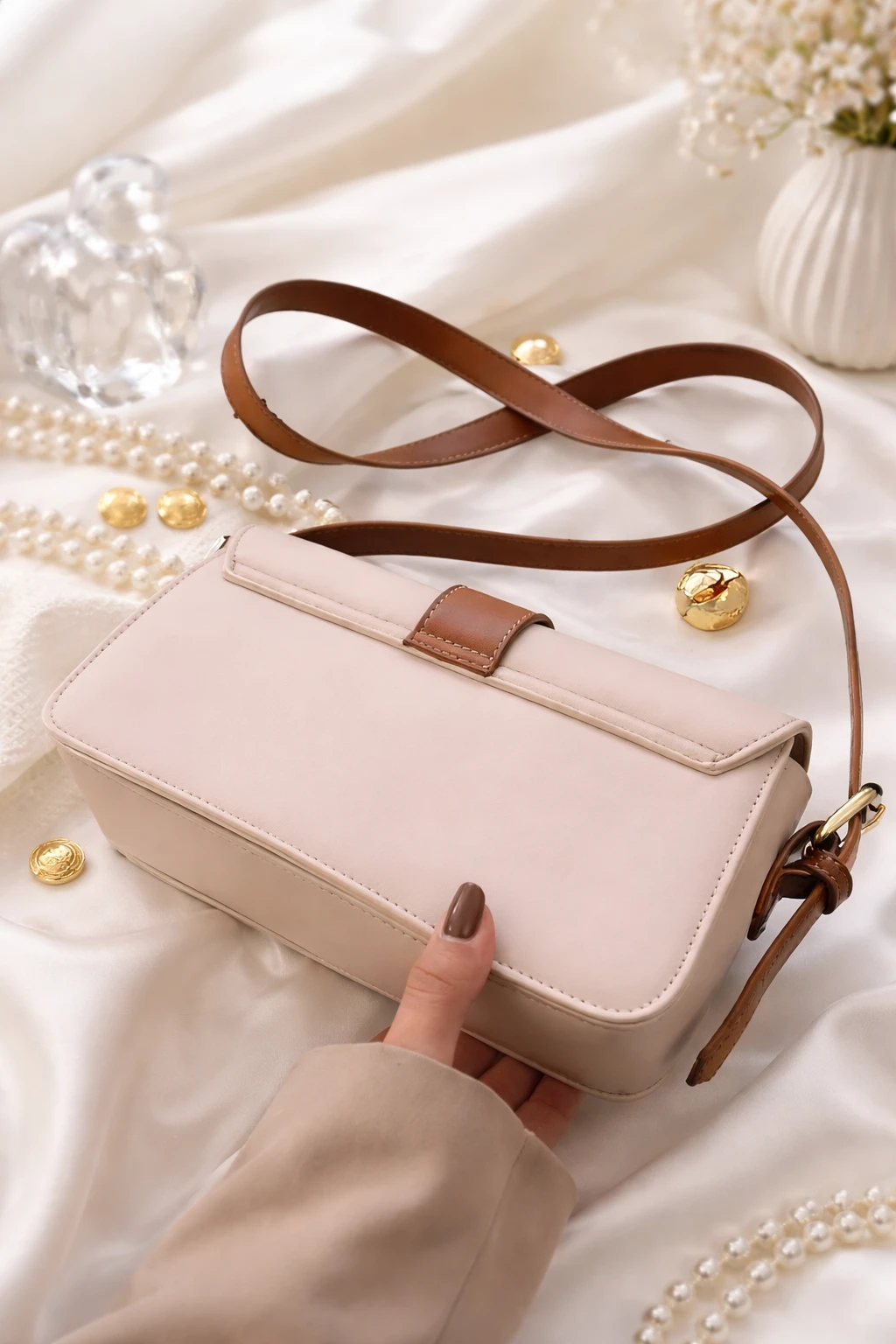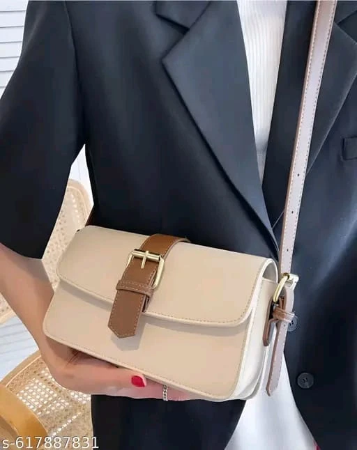 Type: Crossbody Sling Bag Material: Premium Quality Faux Leather Color: Beige with Brown Strap Closure: Stylish Front Buckle Flap Strap Type: Adjustable Shoulder Strap Size: Compact & Handy Compartments: 1 Main Compartment + Inner Space for Essentials Capacity: Fits Mobile, Wallet, Keys, Makeup Weight: Lightweight & Easy to Carry Occasion: Daily Use, Travel, Shopping, Casual Outings