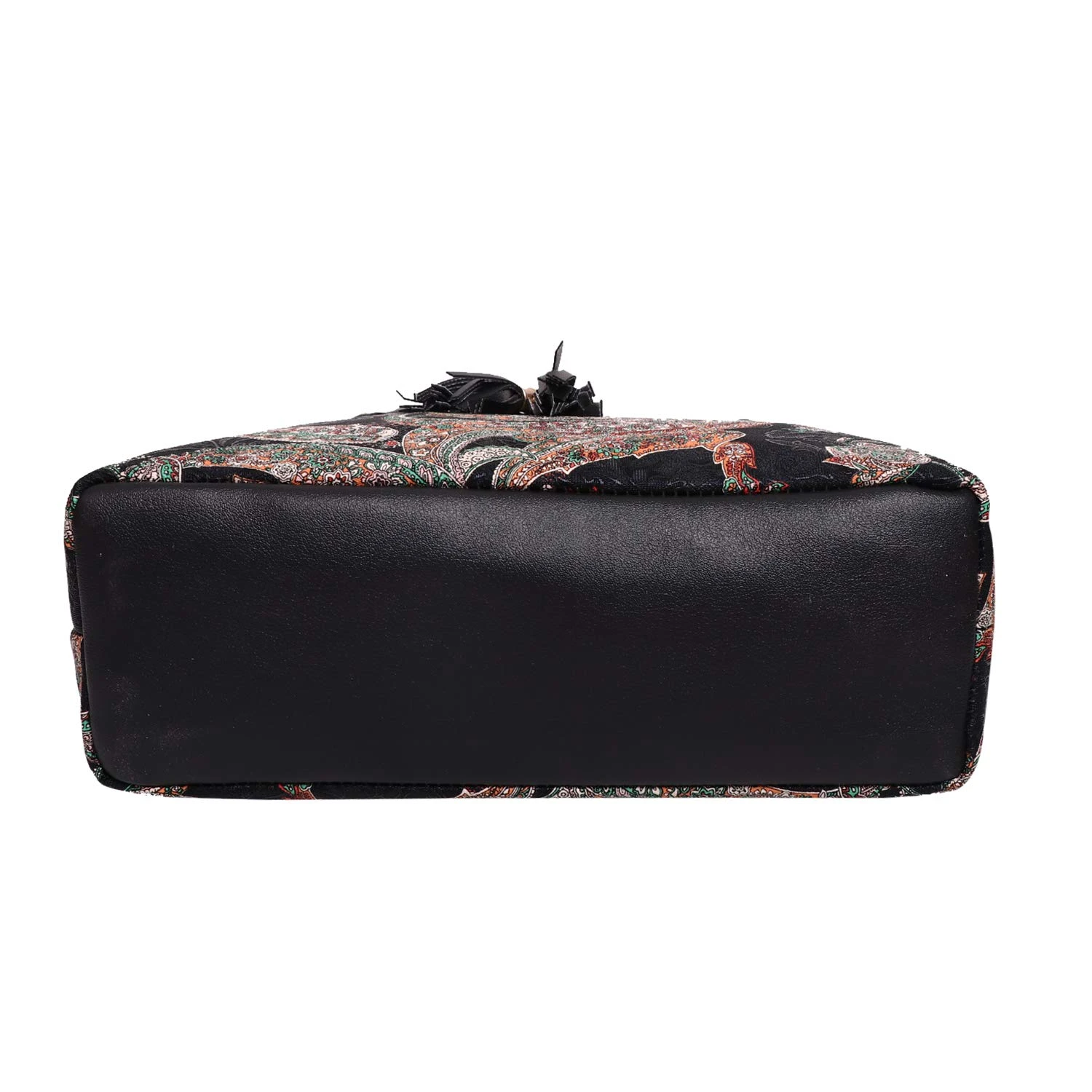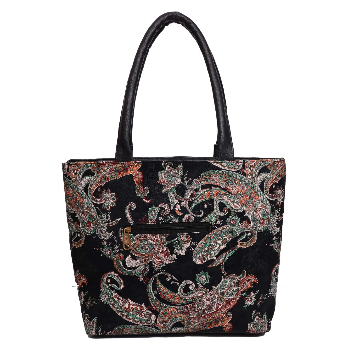 black print pu 2 main compartment zipper and 1 back side zip pockets and i inner pockets. |