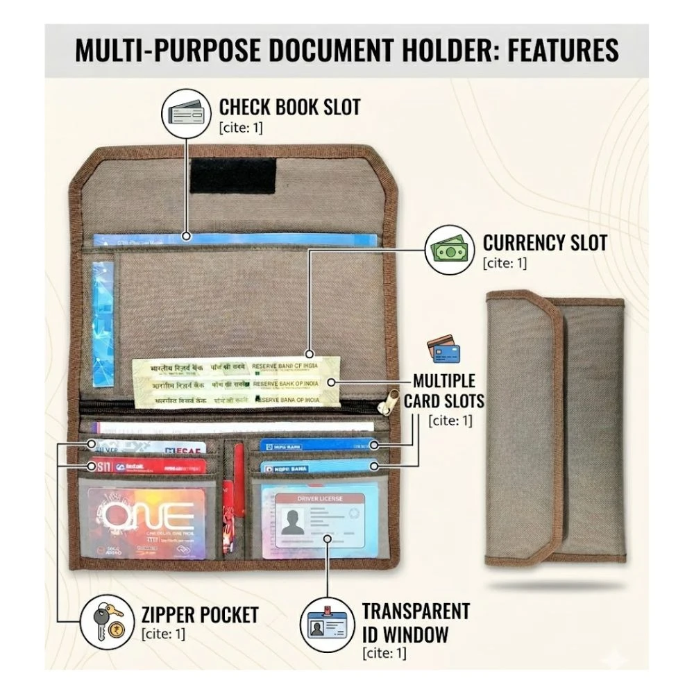 Keep your important documents safe, organized, and easy to access with this Multipurpose Document Holder Wallet. Designed with a compact and slim structure, this organizer is perfect for storing your cheque book, passbook, cards, vehicle documents, and other essential papers in one convenient place. Made with durable fabric material and strong stitching, this document holder ensures long-lasting use and reliable protection for your valuable items. Its lightweight and portable design allows you to easily carry it in your bag, car, or while traveling. The wallet features multiple storage pockets, card slots, and a secure zipper compartment, helping you keep your documents neatly arranged and protected. Whether for daily use, office needs, or travel purposes, this multipurpose organizer is a practical and stylish solution for managing your documents.