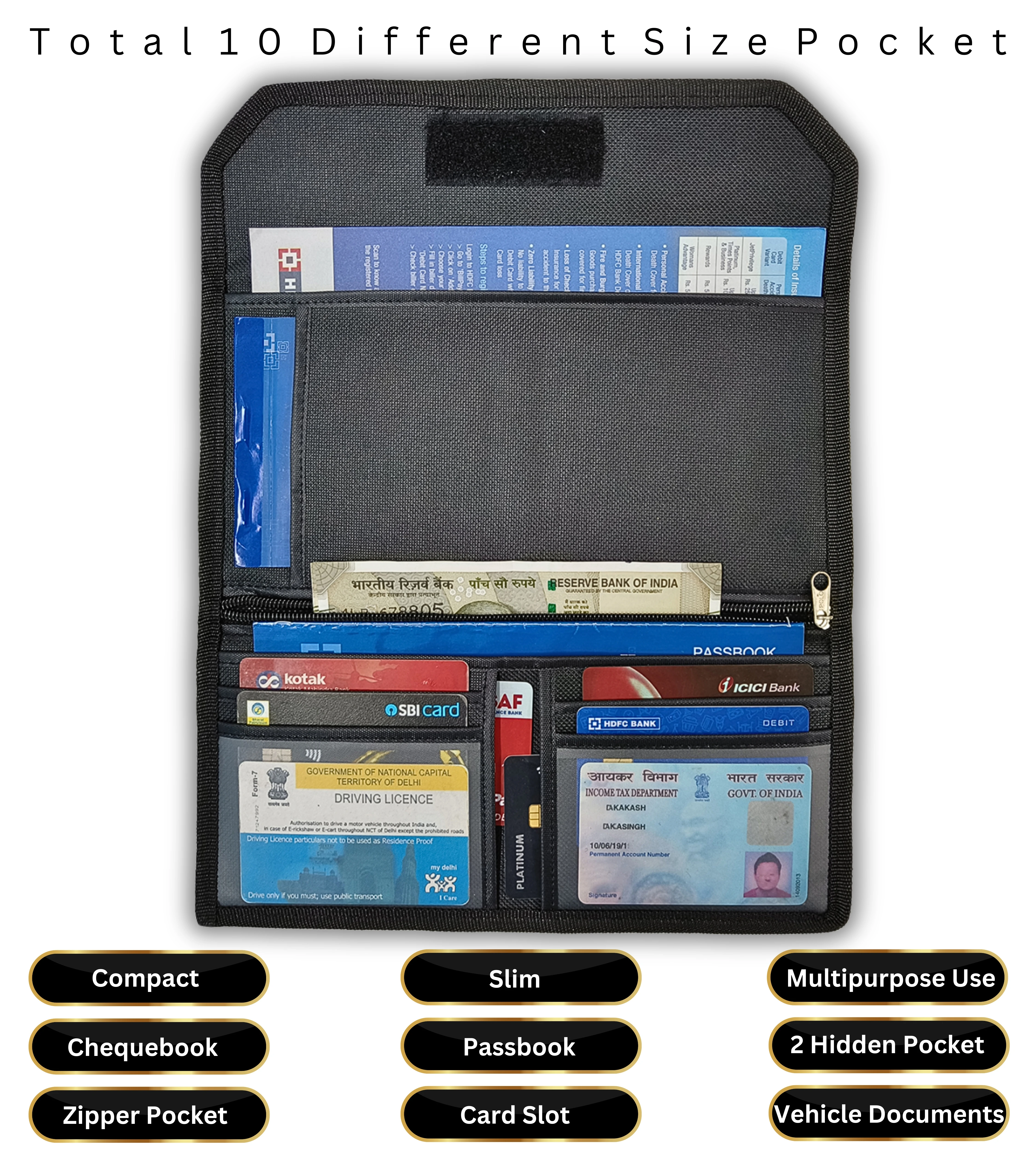 Keep your important documents safe, organized, and easy to access with this Multipurpose Document Holder Wallet. Designed with a compact and slim structure, this organizer is perfect for storing your cheque book, passbook, cards, vehicle documents, and other essential papers in one convenient place. Made with durable fabric material and strong stitching, this document holder ensures long-lasting use and reliable protection for your valuable items. Its lightweight and portable design allows you to easily carry it in your bag, car, or while traveling.