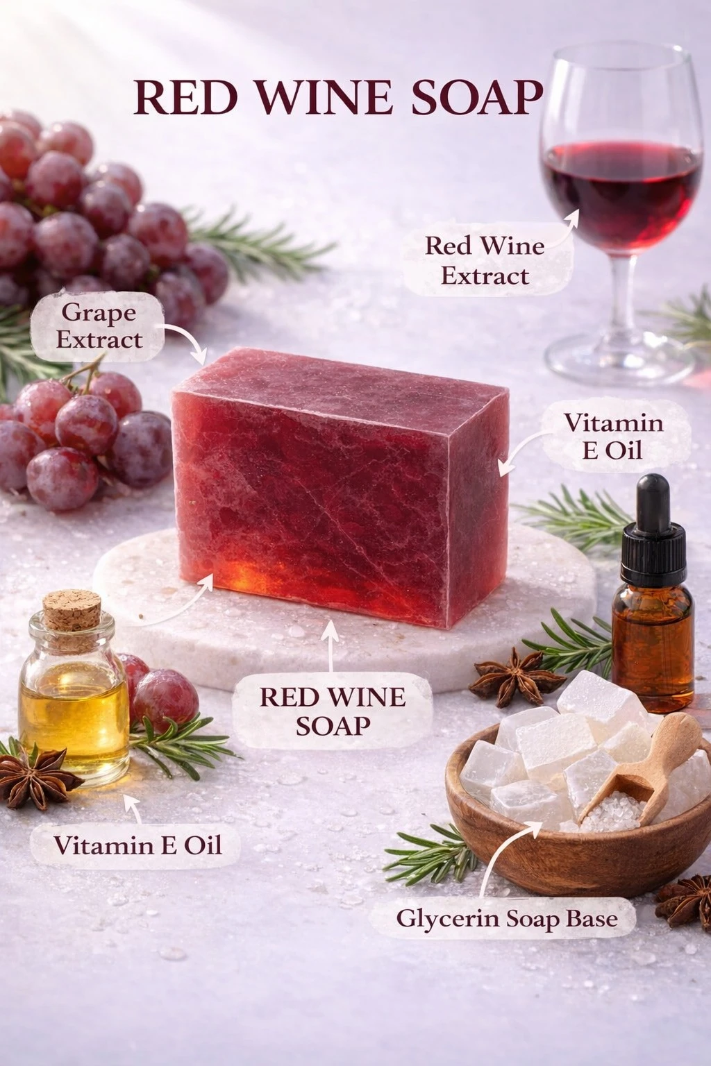 Red Wine Soap is a premium handmade soap crafted with a rich red wine color and a subtle grape-inspired fragrance. Enriched with red wine extract and antioxidants, it gently cleanses the skin while helping to improve its natural radiance. The glycerin-based formula helps retain moisture, leaving the skin soft, smooth, and refreshed without causing dryness. Suitable for all skin types, this soap is ideal for daily face and body cleansing. Its luxurious appearance and spa-like feel make it perfect for both personal use and gifting. Rich in antioxidants that help protect skin Helps improve skin glow and radiance Gently cleanses without drying the skin Helps maintain natural moisture balance Leaves skin soft, smooth, and refreshed Provides a luxurious, spa-like bathing experience Country |