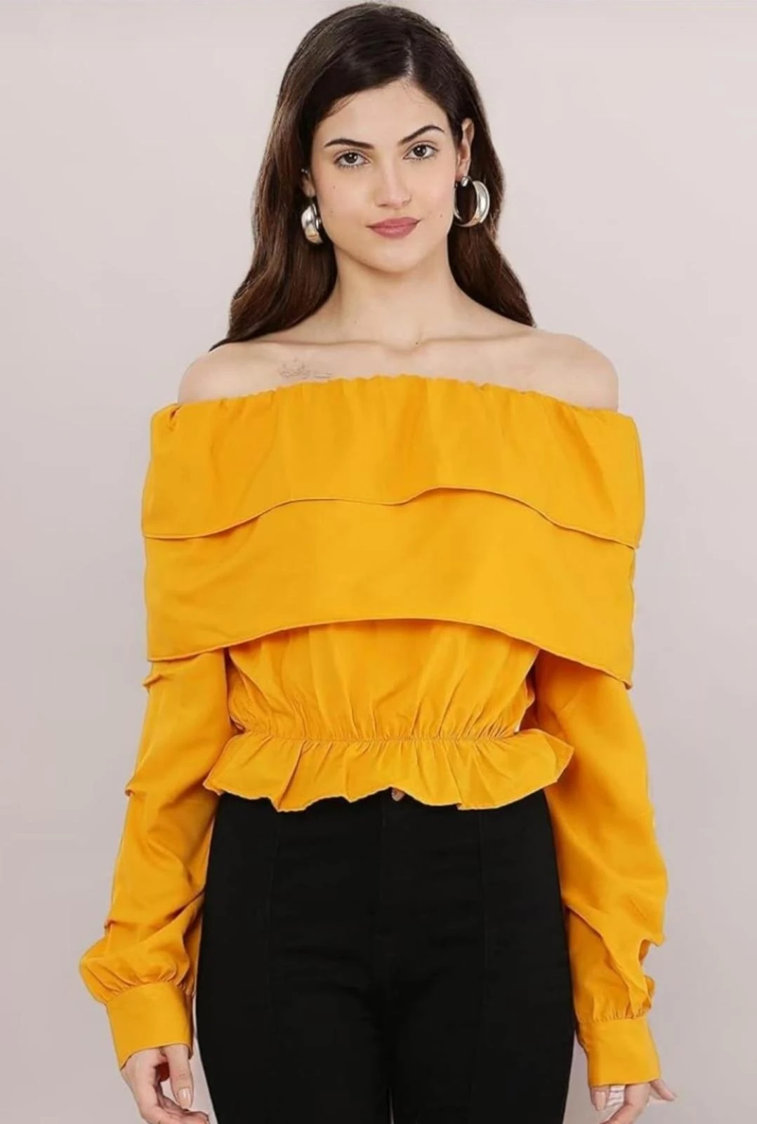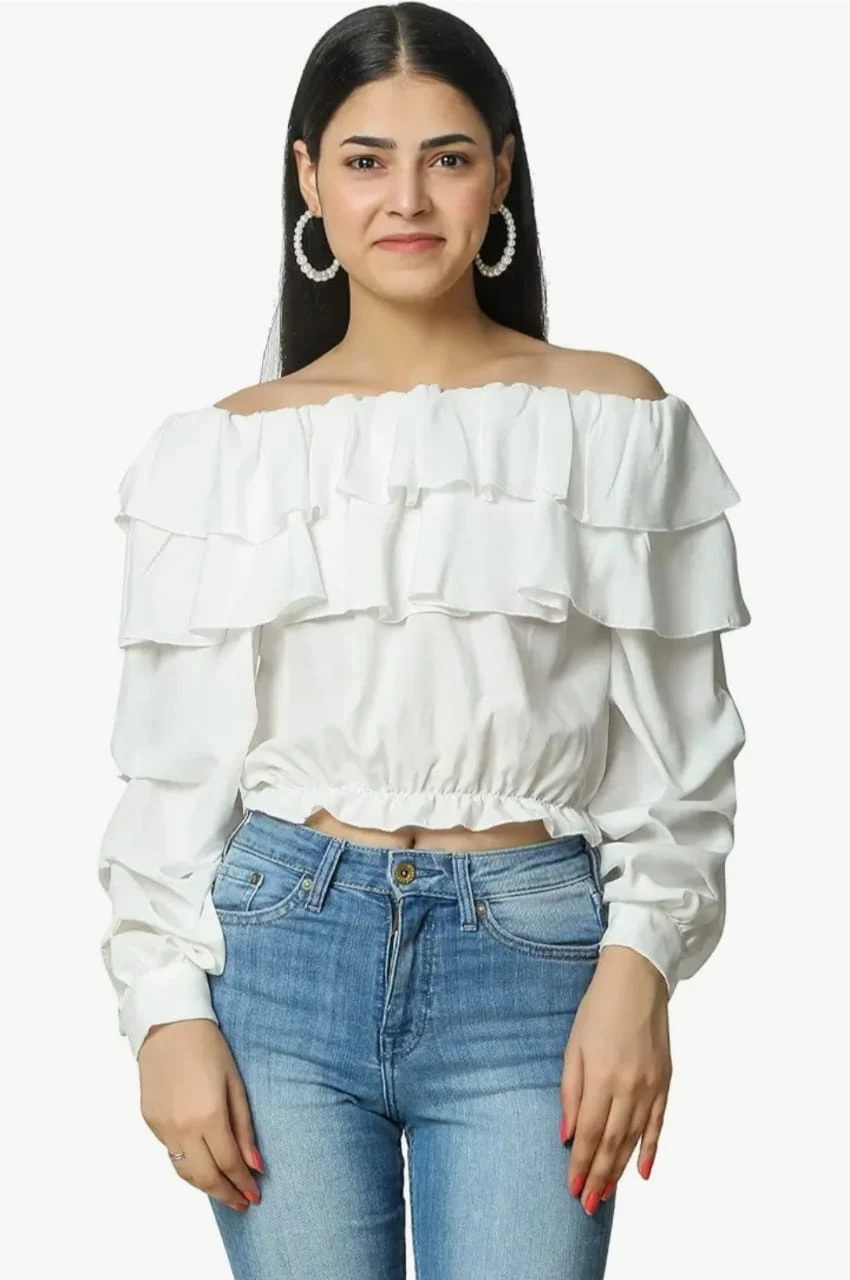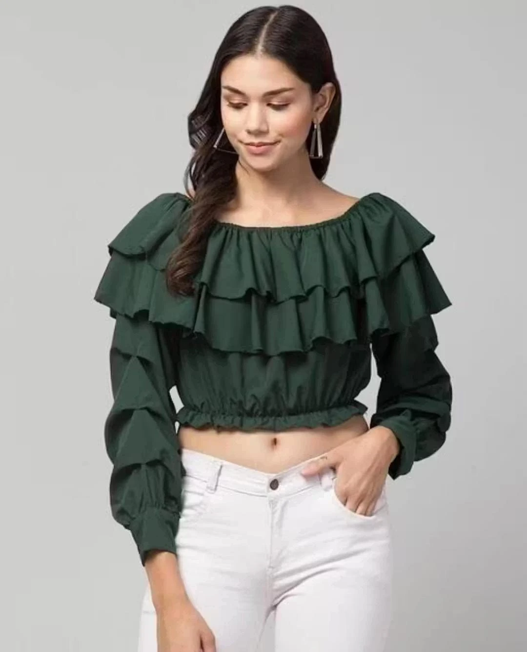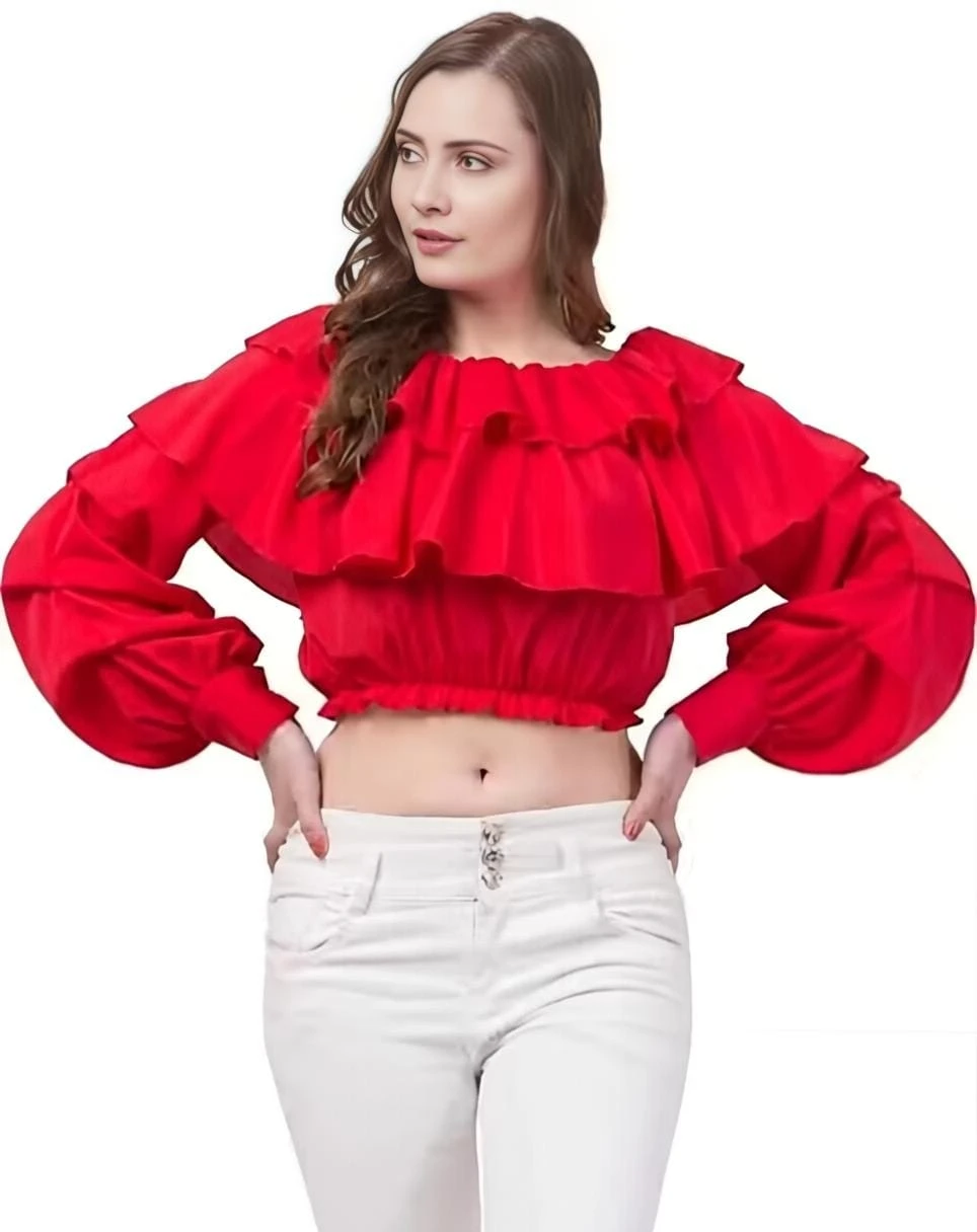 ruffle crop top for girls, designed to bring a perfect blend of sophistication and modern fashion. Featuring beautifully layered ruffles on the front and shoulders, this top creates a graceful and feminine look that instantly elevates any outfit. The soft ruffle detailing adds texture and volume, making it a standout piece for both casual and dressy occasions. Crafted from lightweight and breathable fabric, this crop top offers all-day comfort while maintaining a polished appearance. The smooth material feels soft against the skin and allows easy movement, making it suitable for long hours of wear. Its cropped silhouette is designed to complement high-waisted jeans, skirts, shorts, or trousers, helping you create a balanced and trendy outfit effortlessly. Perfect for fashion-forward girls who love modern trends with a feminine touch, this ruffle crop top is a must-have addition to any wardrobe. Stylish, comfortable, and effortlessly elegant, it’s the perfect piece to make a fashionable statement wherever you go. Classic Black Color – A timeless shade that pairs easily with jeans, skirts, or trousers. Trendy Cropped Fit – Modern crop style perfect for high-waisted bottoms. Soft & Comfortable Fabric – Lightweight and breathable material for all-day comfort. Long Sleeve Style – Adds a touch of sophistication while keeping the look stylish. Versatile Fashion Piece – Ideal for casual outings, parties, dates, or everyday wear.