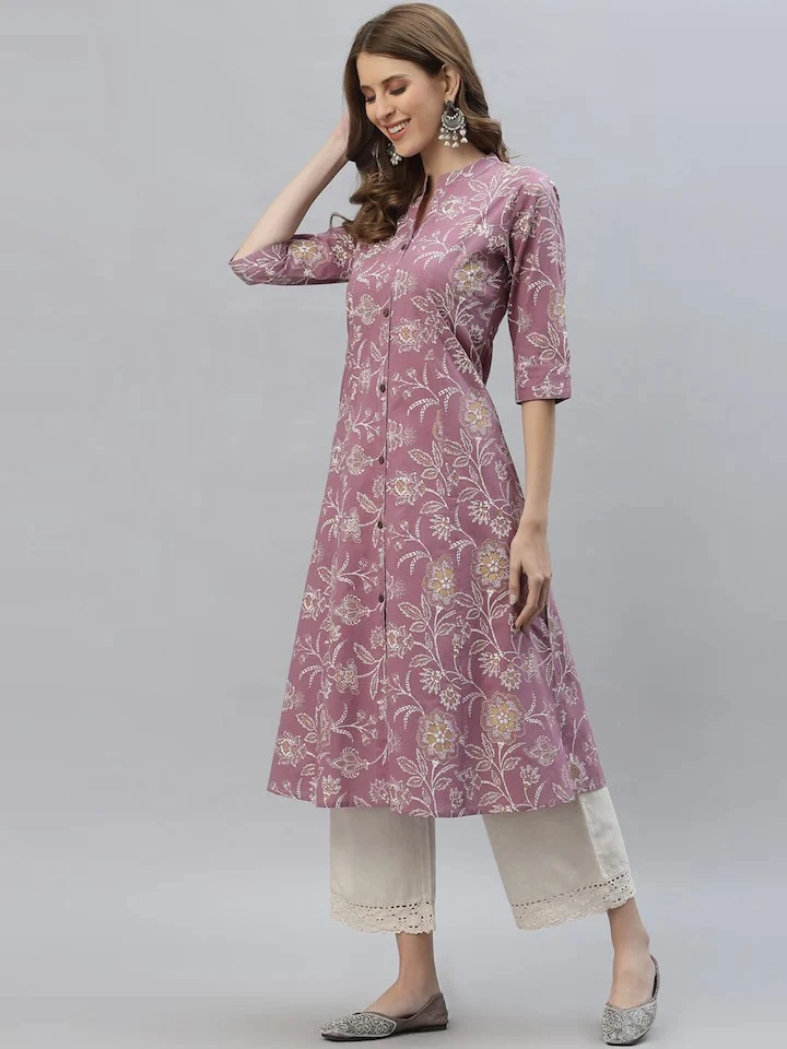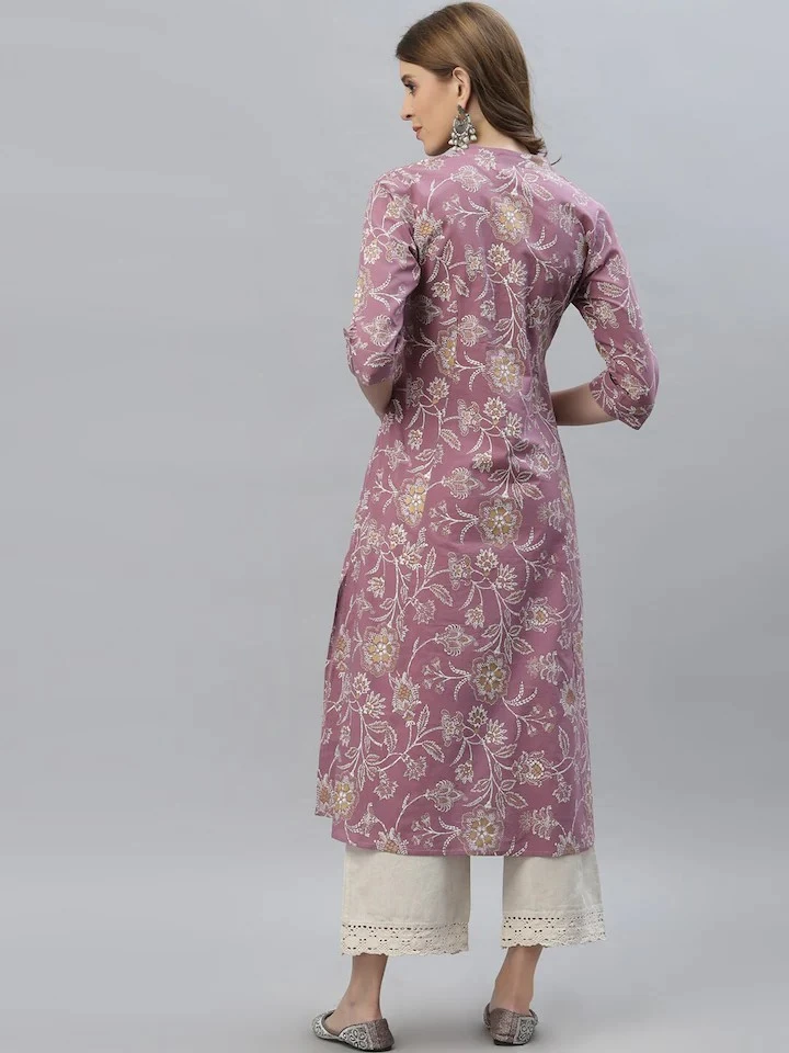 Crafted from rayon fabric in a lovely shade of pink, this kurta is truly exquisite; it features intricate gold printing in its design. It serves as an excellent choice for both parties and office wear, offering a highly comfortable fit. The print is exceptionally attractive. For care, simply hand wash it normally and avoid using bleach. This item is available at a remarkably affordable price. |