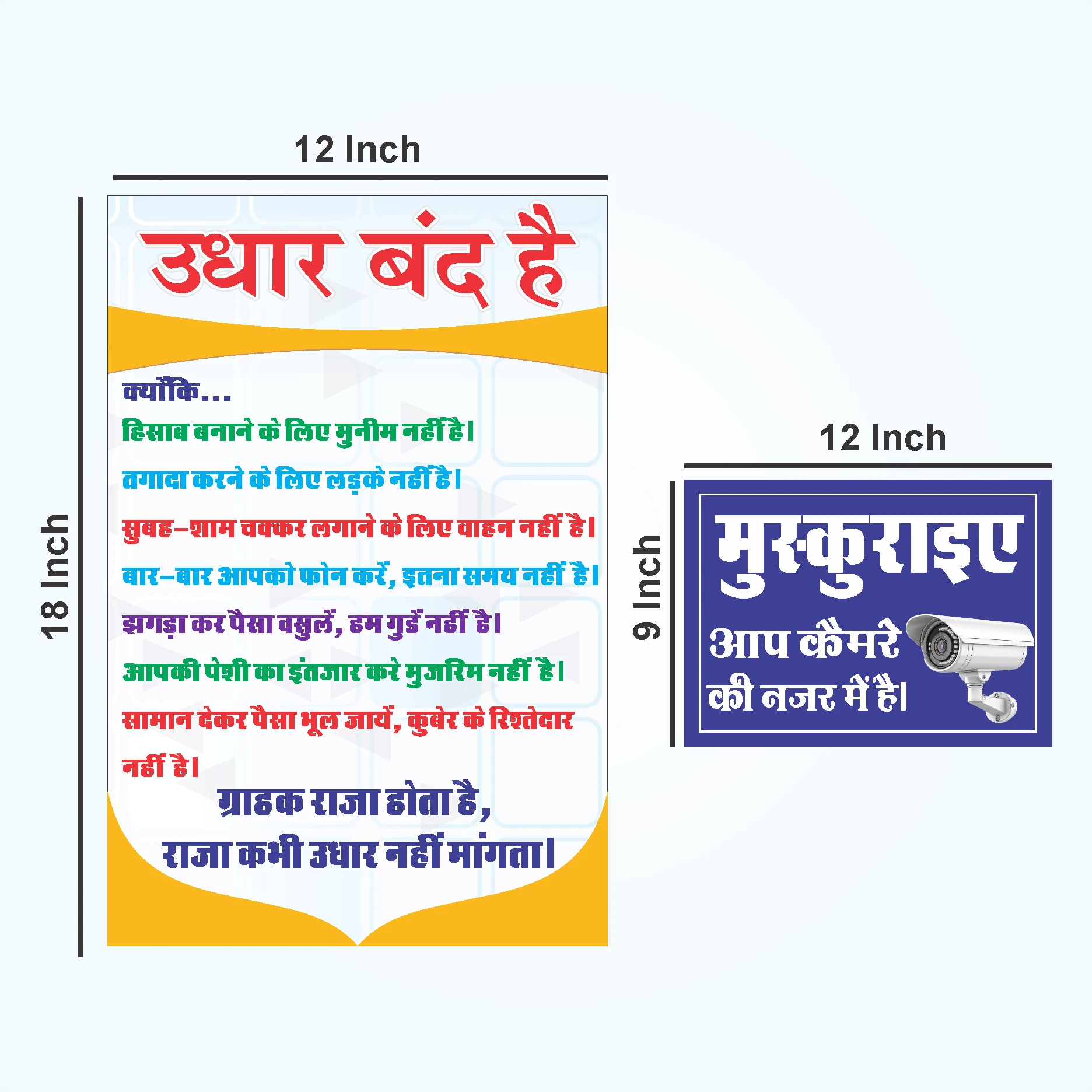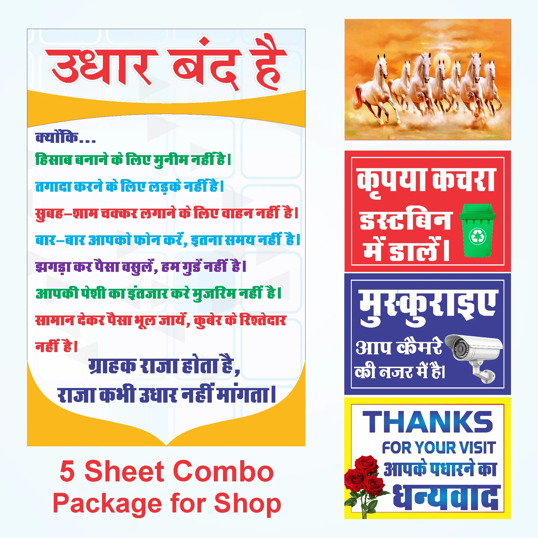Upgrade your business space with this exclusive pack of 5 stickers designed specifically for shop owners and offices. This combo covers all your basic communication needs with customers: No Credit (Udhar Band Hai) Poster (18x12 Inch): Politely but firmly informs customers about your "No Credit" policy with catchy reasons. CCTV Security Sign: Alerts visitors that they are under camera surveillance for safety. Cleanliness Sign (Dustbin): Encourages customers to keep the premises clean by using the dustbin. Gratitude Sign (Thanks for Visit): A polite "Welcome & Thank You" message to build customer loyalty. Devotional Poster (Khatu Shyam Ji): Adds a touch of spirituality and positivity to your workspace. These stickers are waterproof, dust-resistant, and long-lasting, making them a one-time investment for your shop’s decor and management. |