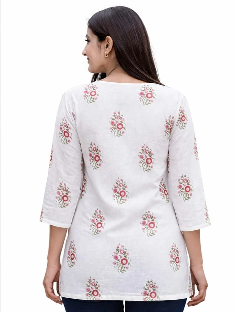 Upgrade your daily wardrobe with this stylish Women’s Printed Cotton Short Kurti. Made from soft and breathable cotton fabric, this kurti ensures all-day comfort and a lightweight feel. The elegant floral print on a white base gives it a fresh and trendy look, perfect for casual outings, office wear, or daily use. |