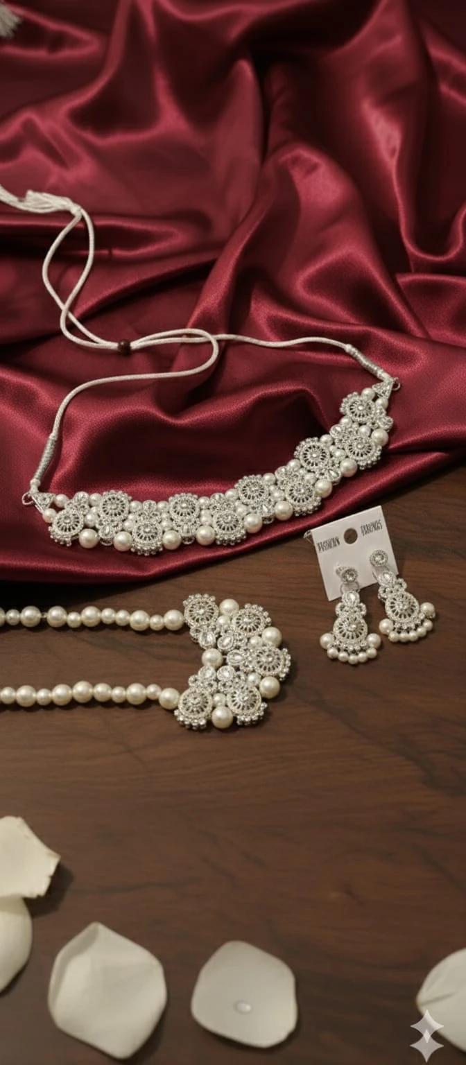 Elegant and stylish silver-tone choker necklace set designed with intricate floral patterns and beautiful pearl detailing. This set includes a matching pair of earrings, making it perfect for weddings, parties, and festive occasions. Lightweight and comfortable to wear, it enhances your traditional as well as modern outfits. |