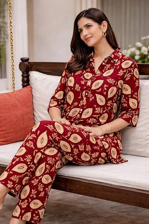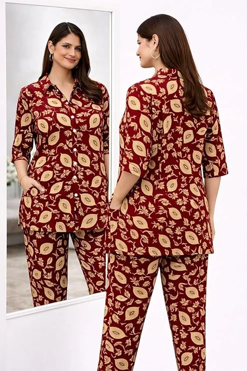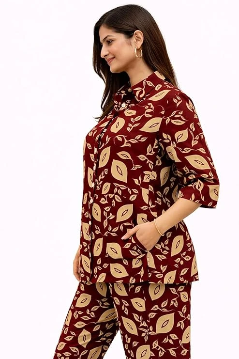 Women Printed Co-Ord Set | Leaf Print Shirt Top with Pant Set | Casual Cotton Co-Ord Set for Women | Stylish Office Wear Outfit