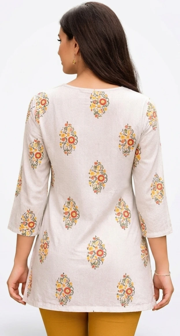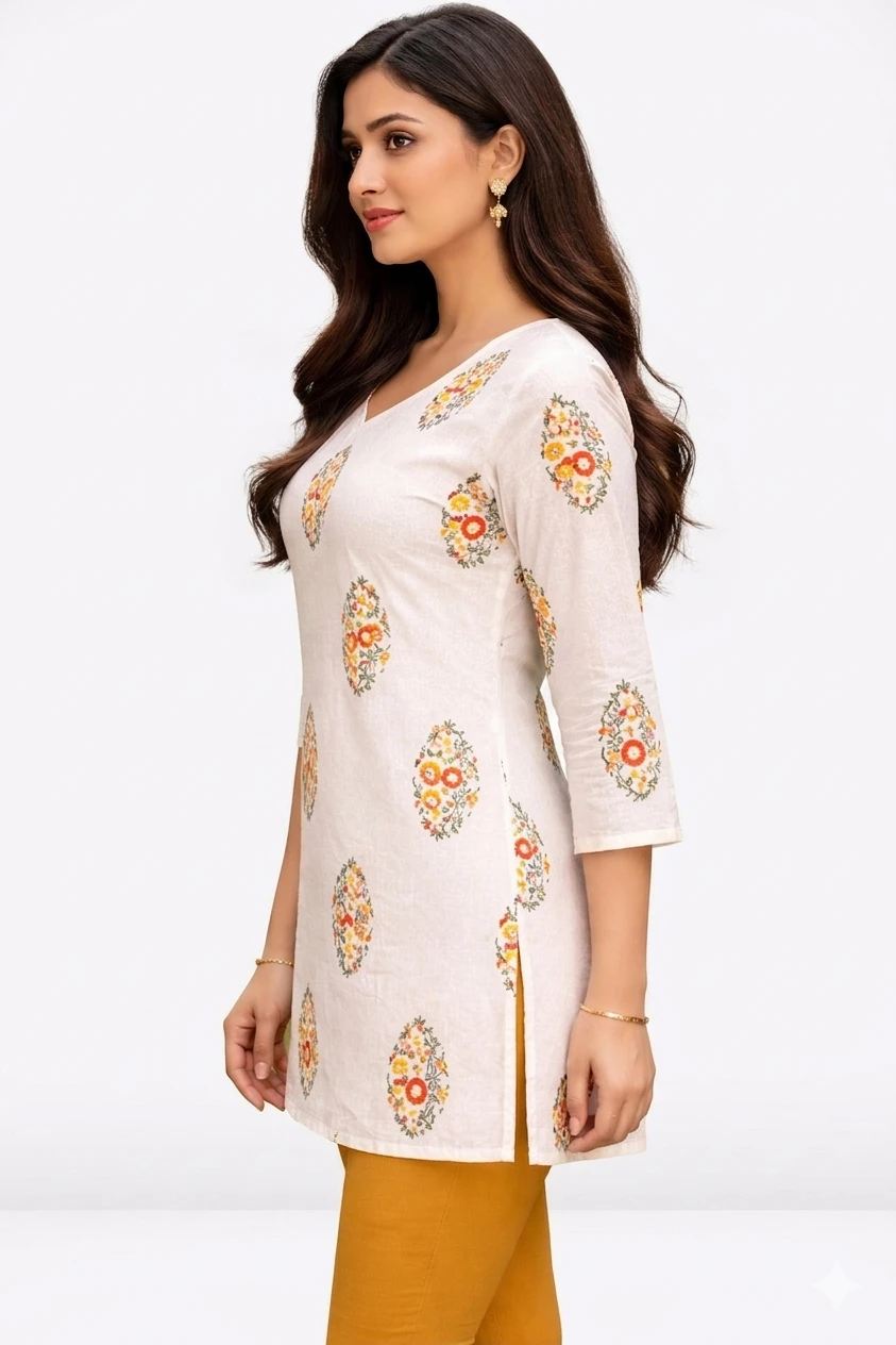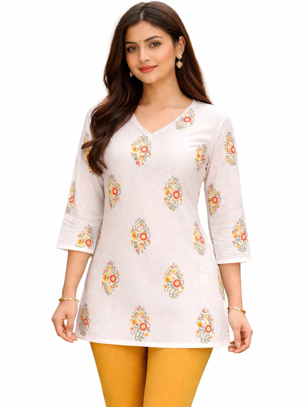 Upgrade your everyday style with this elegant printed short kurti made from premium cotton fabric. Designed with a stylish V-neck and 3/4 sleeves, this kurti offers both comfort and a modern ethnic look. The floral print adds a fresh and trendy touch, making it perfect for daily wear, office, or casual outings. Pair it with leggings or jeans for a complete look. |