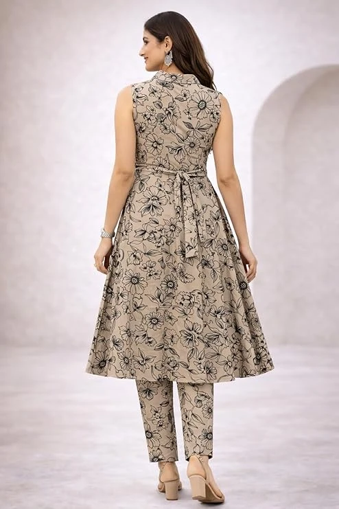 Women’s Beige Floral Printed Co-Ord Set | Sleeveless Kurti with Straight Pants | Casual Ethnic Summer Outfit