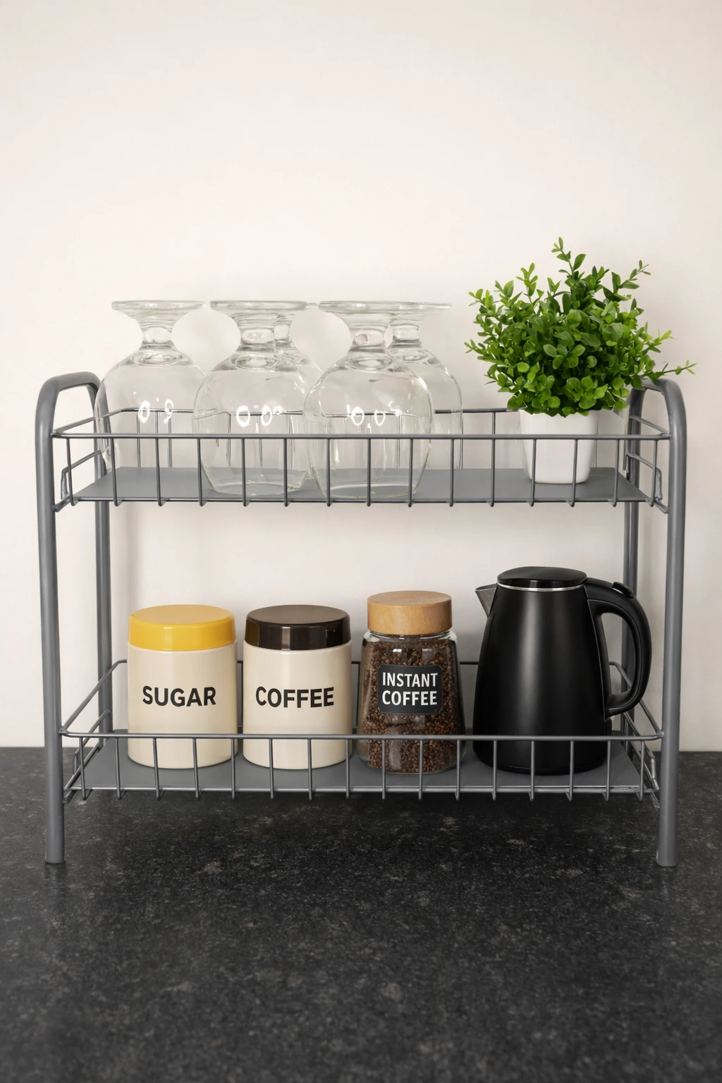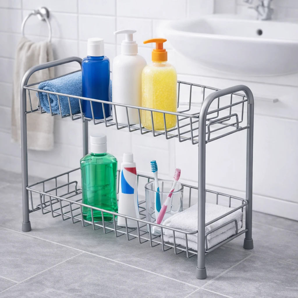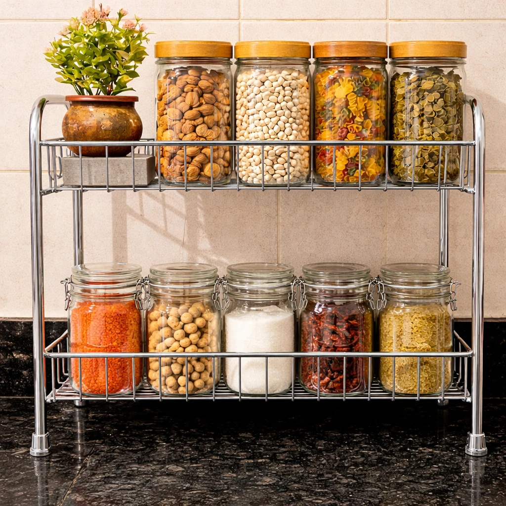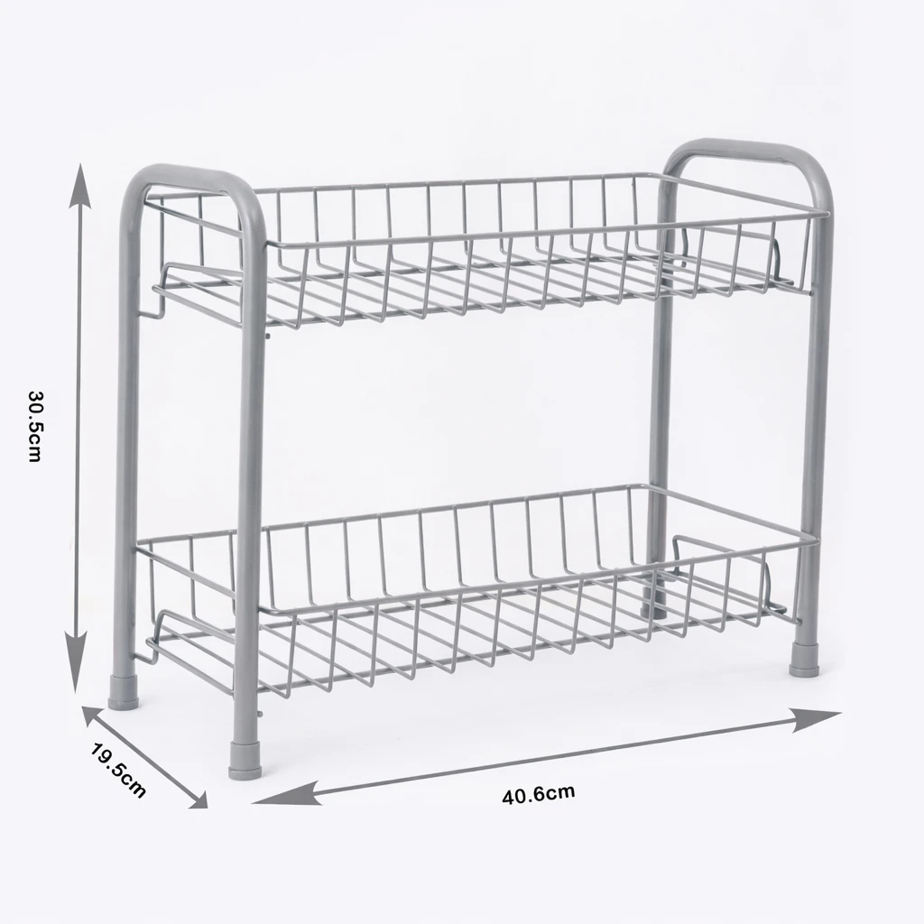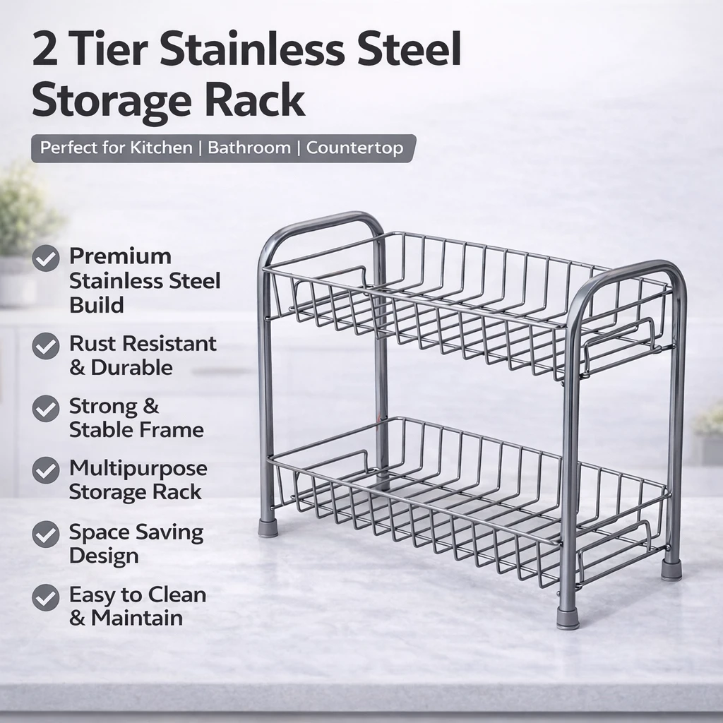 Upgrade your kitchen organization with this 2-Tier Grey Kitchen Rack, designed to maximize storage while keeping your countertop neat and clutter-free. The sturdy metal construction with a modern grey finish offers durability, stability, and a stylish look that fits perfectly in any kitchen décor. The two spacious tiers provide ample space for storing spice jars, containers, sauces, condiments, and kitchen utensils, making everyday cooking more convenient. Its compact space-saving design allows you to organize essential items efficiently without taking up too much countertop space. This multipurpose rack is not only ideal for kitchens but can also be used in pantries, bathrooms, dressing tables, or offices to organize cosmetics, toiletries, or small accessories. The strong frame ensures long-lasting performance and stable support for your storage needs. Many similar racks are designed specifically to store spices and condiments neatly while saving counter space. Perfect for modern homes, this heavy-duty organizer rack helps you keep everything within reach while maintaining a clean and organized kitchen. Key Features