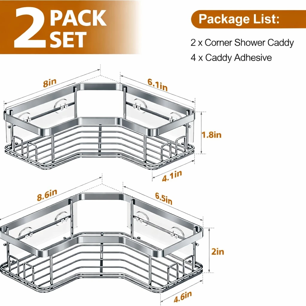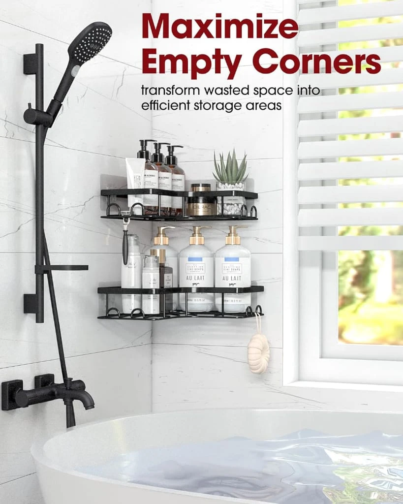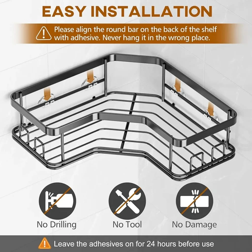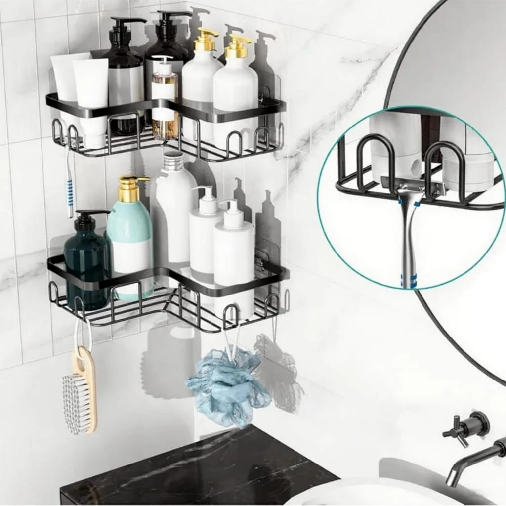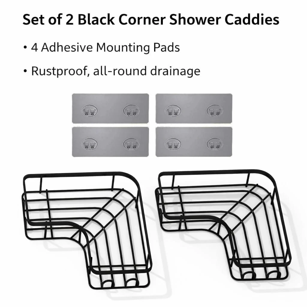 Maximize your space with this Bathroom Corner Rack Shelf (2 Pack) — a stylish and practical solution for organizing your essentials. Designed specifically for 90° right angle corners, this matte black corner shower caddy adds a modern touch while keeping your bathroom or kitchen clutter-free. Made from premium rust-resistant material, these shelves are built to withstand moisture and daily use. The self-adhesive installation ensures a strong hold without the need for drilling, making it perfect for renters and hassle-free setup. Use it in your bathroom to store shampoos, soaps, and toiletries, or in your kitchen for spices and small containers. The open design allows for quick drainage and easy cleaning, keeping your items dry and hygienic. ✨ Key Features: