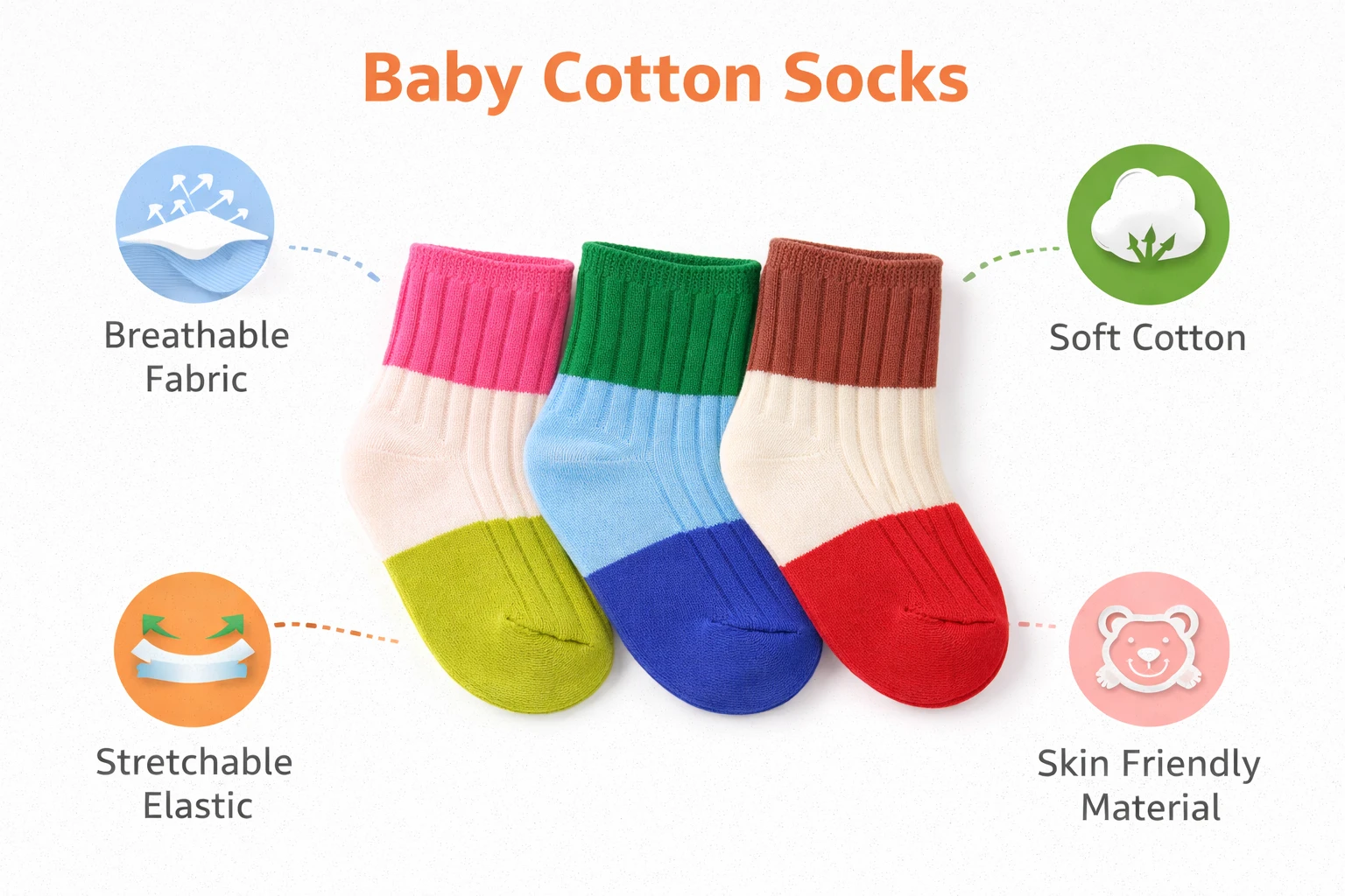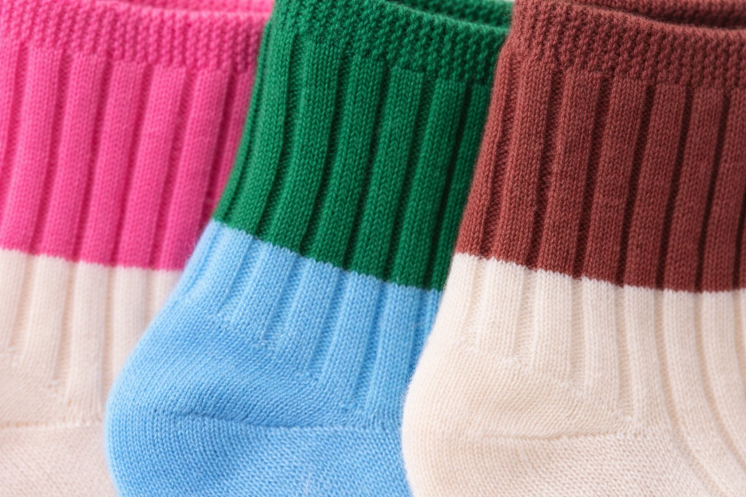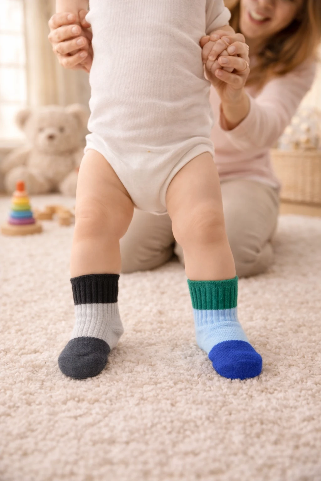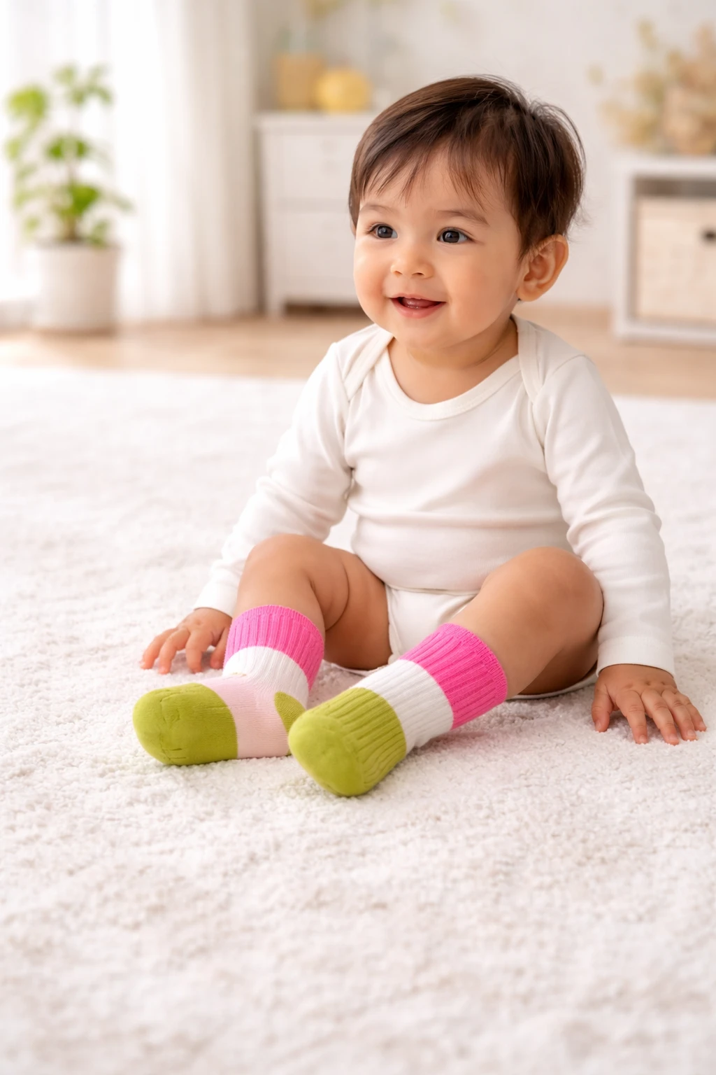 Brighten up your little one’s wardrobe with this adorable pack of 3 colorful socks, specially designed for kids aged 1–2 years. Each pair features a fun color-block pattern that adds a playful touch to everyday outfits. Made from soft, breathable, and skin-friendly fabric, these socks keep tiny feet cozy and comfortable throughout the day. The gentle stretch ensures a snug fit without being too tight, while the ribbed cuffs help keep the socks securely in place during all their little adventures.