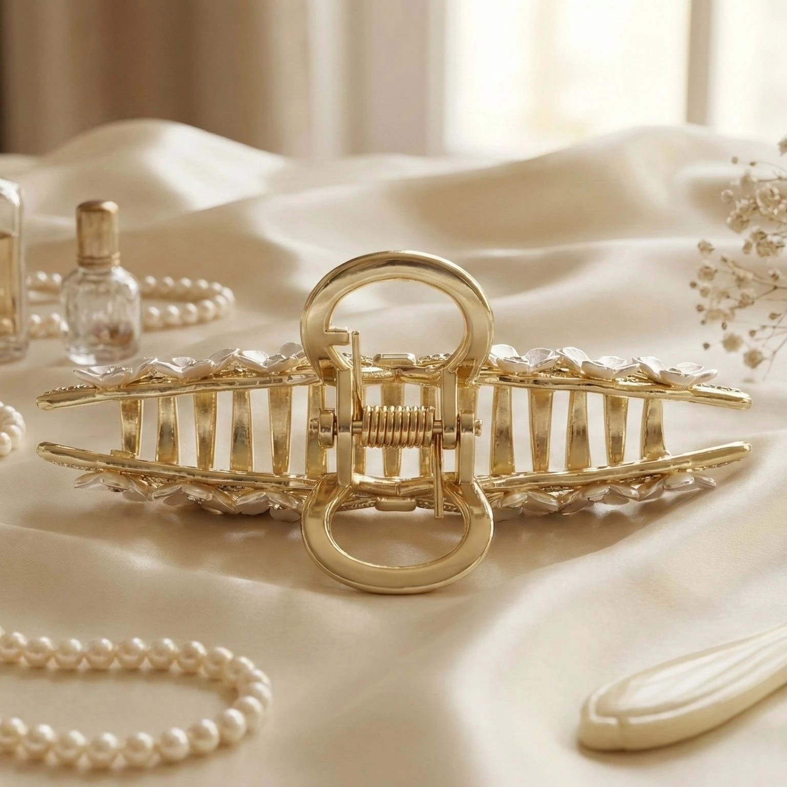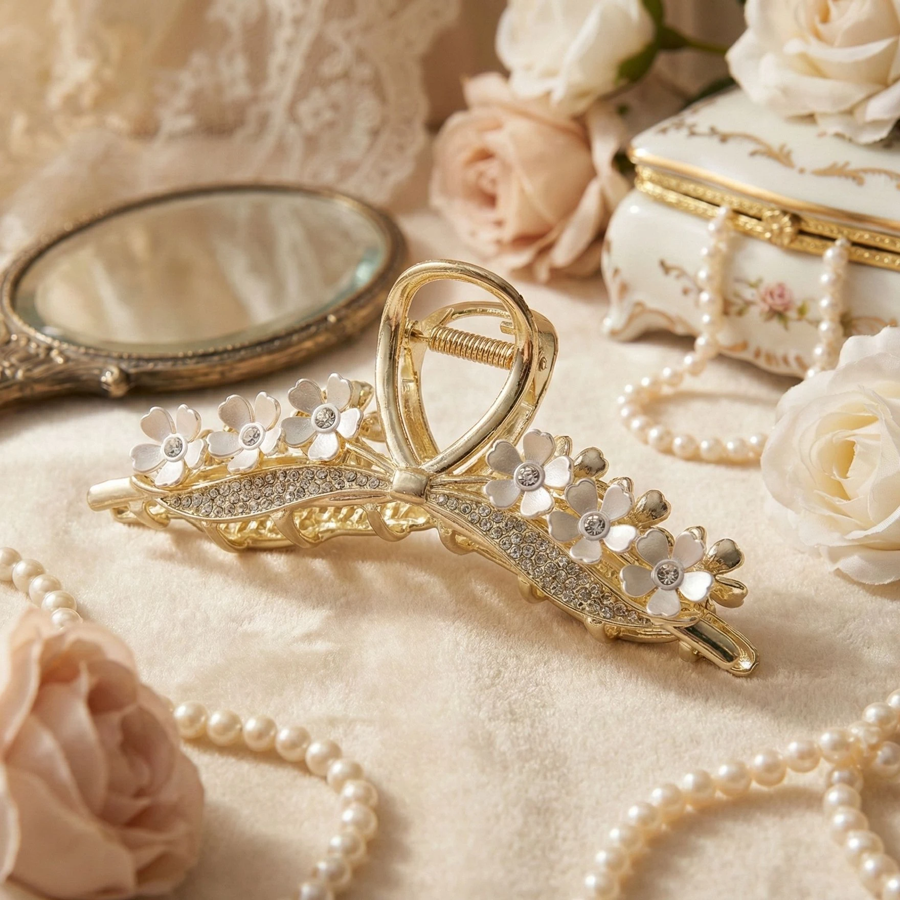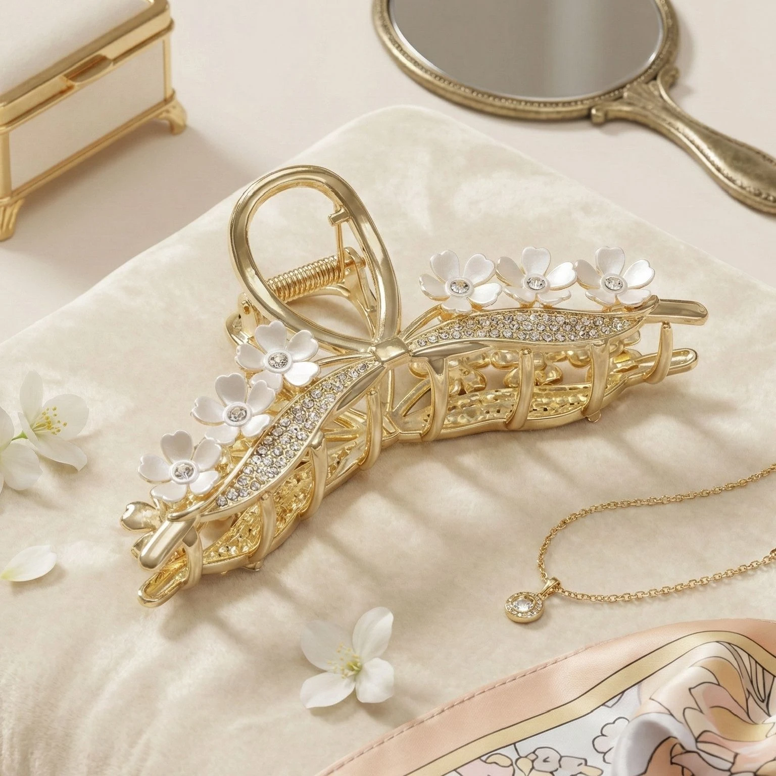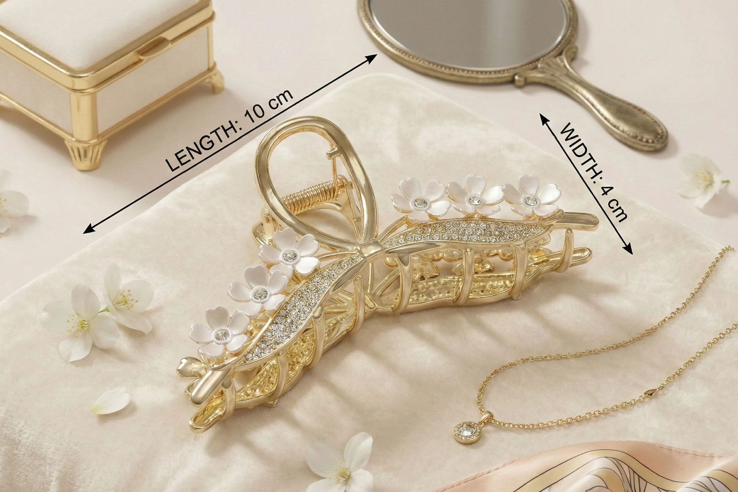 Bellotoko Elegant Gold Metal Hair Claw Clip with White Flowers & Sparkling Rhinestones Transform your everyday look into a masterpiece of elegance. This isn't just a hair clip; it’s a high-end fashion statement designed for the modern woman who values grace, quality, and style. Perfectly suited for weddings, brunch dates, or elevating your daily office attire, this Floral Gold Claw Clip is the ultimate "must-have" accessory of the season. Masterpiece Design & Intricate Detailing