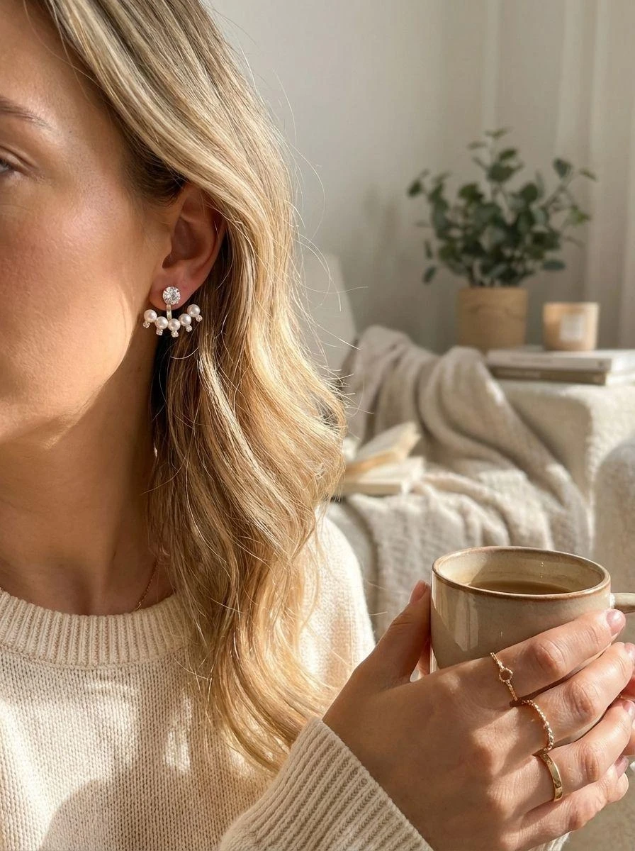 Elevate your style with these stunning Blisskart Ear Jacket Earrings. Designed for the modern woman who loves a touch of classic elegance, these earrings feature high-quality artificial pearls and sparkling Cubic Zirconia (CZ) stones set in a premium gold-toned finish. The unique "ear jacket" design allows the pearl arc to sit beautifully behind your earlobe, creating a trendy 3D look that stands out at any event. ✨Key Highlights: Brand: Blisskart Design: Modern Ear Jacket / Ear Crawler style with a floral pearl arc. Material: Skin-friendly alloy with premium gold plating, faux pearls, and AAA-grade CZ stones. Versatility: Perfect for weddings, parties, office wear, or casual outings. Comfort: Lightweight design ensures you can wear them all day without irritation. Care Instructions: Wipe with a soft cloth after every use. Keep away from water, perfumes, and sprays to maintain the finish. Korean Earrings,Trending Earrings,Women Earrings,Earrings For Girls,fashion earrings,All-occasion pearl earrings For Womens, |