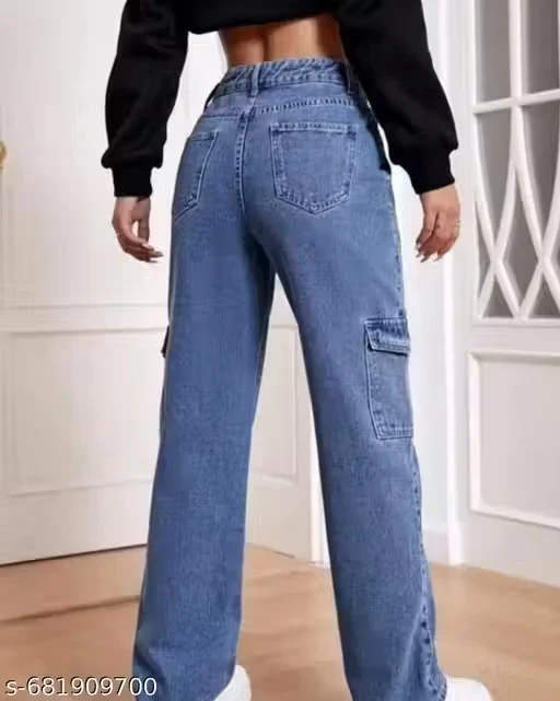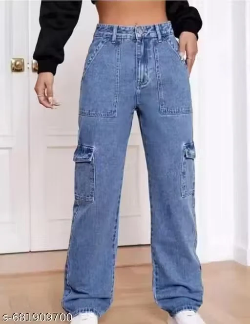 Relaxed Fit 6Pocket Stone Blue Jeans – Women & Girls, High-Waist Style Side Pocket Cargo |