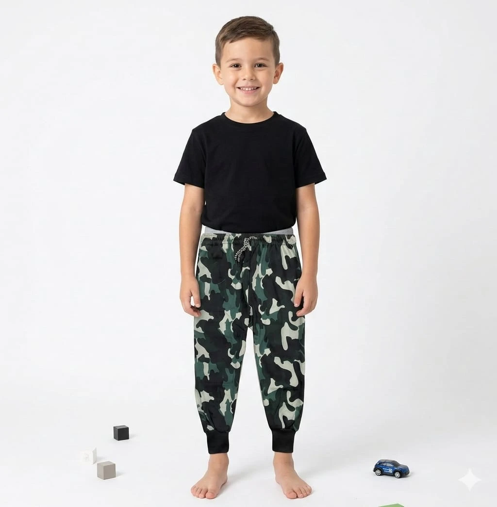 Stylish kids camo jogger pants made from high-quality polyester fabric. Yeh pants lightweight, durable aur comfortable hai, jo daily wear aur outdoor activities ke liye perfect hai. Elastic waistband aur modern army print design ise trendy aur practical banata hai. |