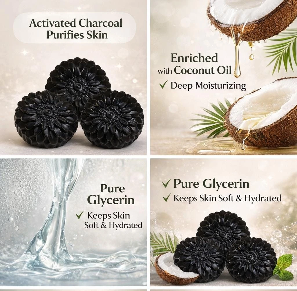 Our Premium Charcoal Soap is made with natural activated charcoal that deeply cleanses the skin by removing dirt, excess oil, and impurities from pores. It helps control acne, blackheads, and pollution damage while keeping the skin fresh, smooth, and healthy. Enriched with skin-friendly natural oils, this soap is gentle enough for daily use and suitable for all skin types. 01. Deep pore cleansing 02. Removes excess oil & impurities 03. Helps reduce acne & blackheads 04. Controls body odor 05. Leaves skin fresh & smooth 06. Suitable for oily & acne-prone skin |