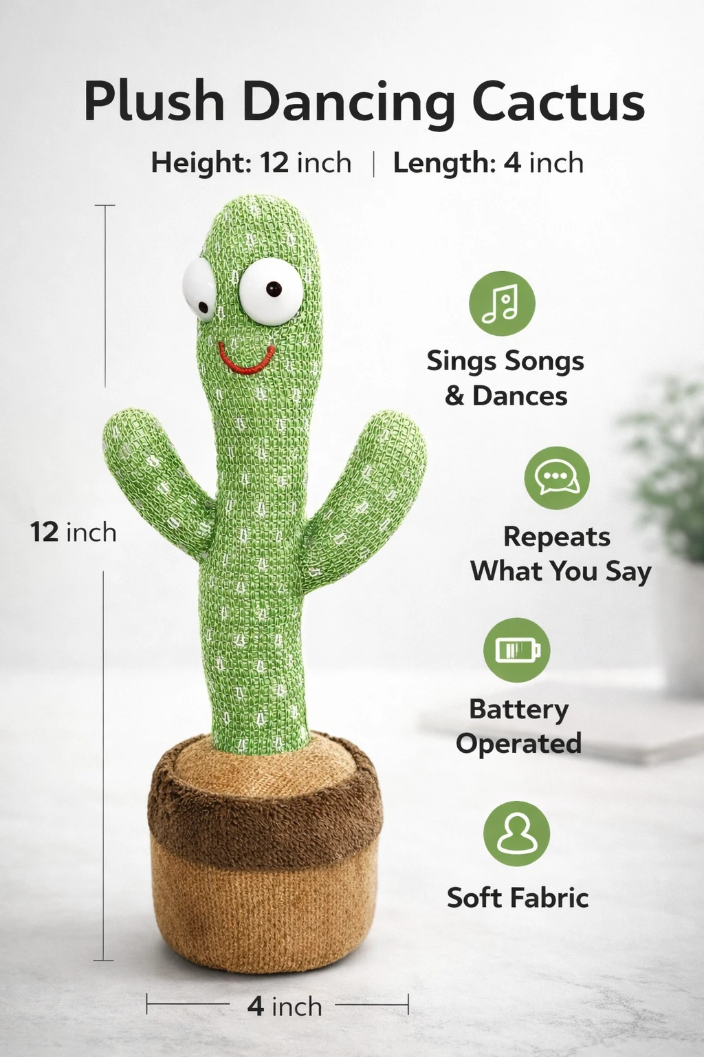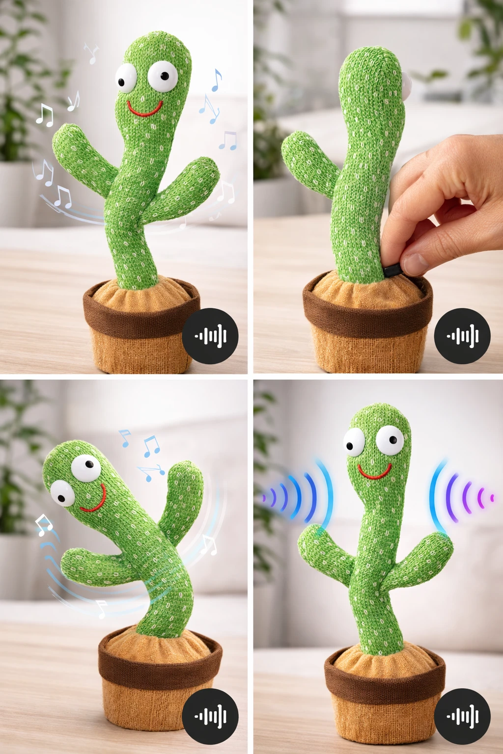 Bring fun and laughter into your home with the HappyGroove Dancing & Talking Cactus Toy ā an entertaining and interactive toy designed for kids and families. This adorable cactus not only dances to music but also repeats what you say in a funny voice, making it a perfect companion for endless fun. Crafted with soft plush fabric, it is safe and comfortable for children to play with. The toy features built-in music and lively dance movements that grab attention and keep kids engaged for hours. Its cute design with big eyes and a cheerful smile adds a playful touch to any room dĆ©cor.