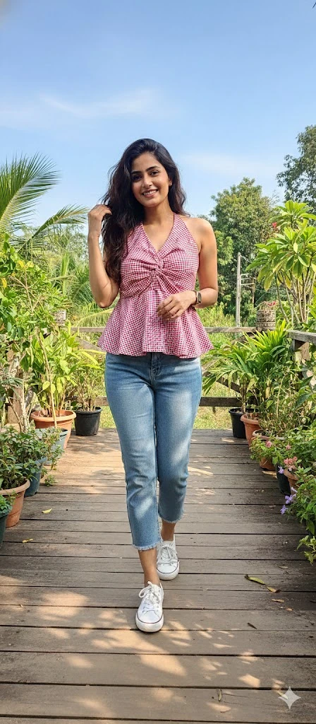 Top: Gingham Halter Peplum Top Yah top classic style aur modern cut hai. Design: Pink aur white gingham (checkered) pattern jo ek timeless vibe deta hai. Style: Ismein halter neck ke saath samne ek stylish twist-front knot detail hai jo ise kaafi feminine banata hai. Fit: Yah ek peplum silhouette mein hai, jo waist par thoda tight aur niche se flared hota hai, jisse ek flattering shape milti hai.