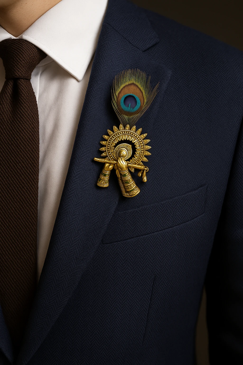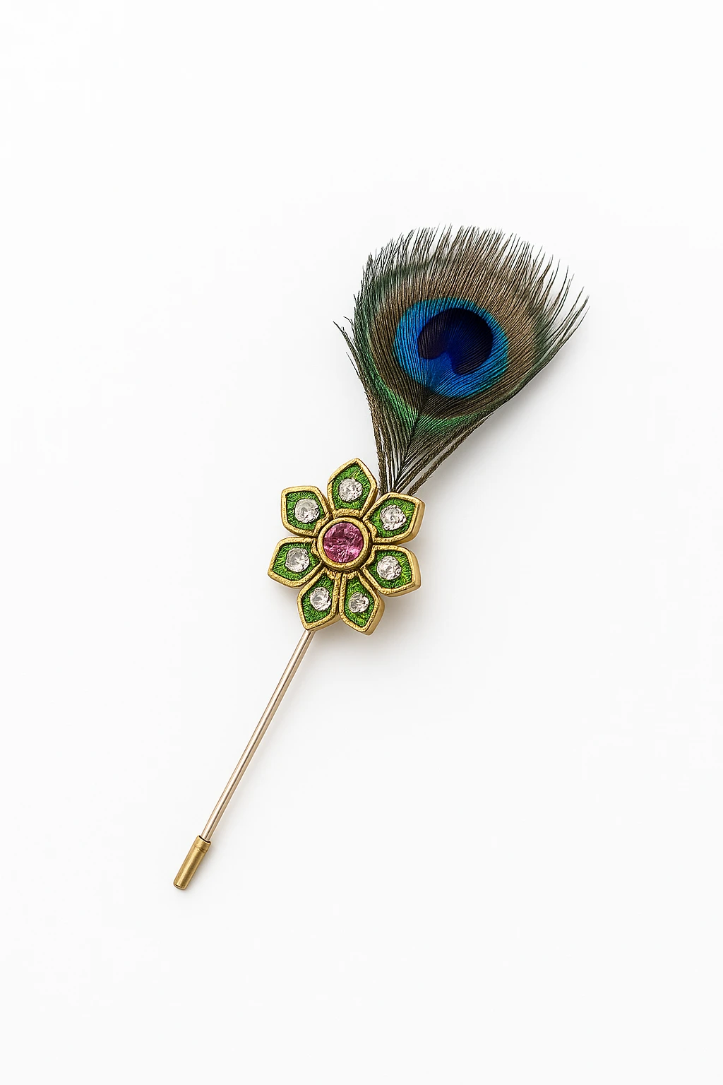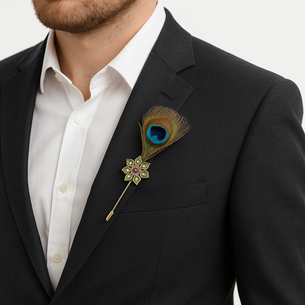 Enhance your traditional and formal outfits with this Elegant Peacock Feather Krishna Brooch Pin, a stylish accessory inspired by classic Indian royal fashion. Featuring a beautifully crafted gold-plated floral design with sparkling crystal stones and a vibrant center gem, the brooch is paired with a natural-style peacock feather that adds a distinctive and graceful touch. Perfect for sherwanis, bandhgalas, blazers, suits, and wedding attire, this brooch instantly elevates your look for weddings, festive celebrations, cultural events, and special occasions. The long stick pin design ensures secure and easy attachment while maintaining a refined, elegant appearance.