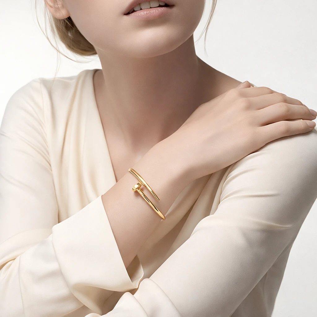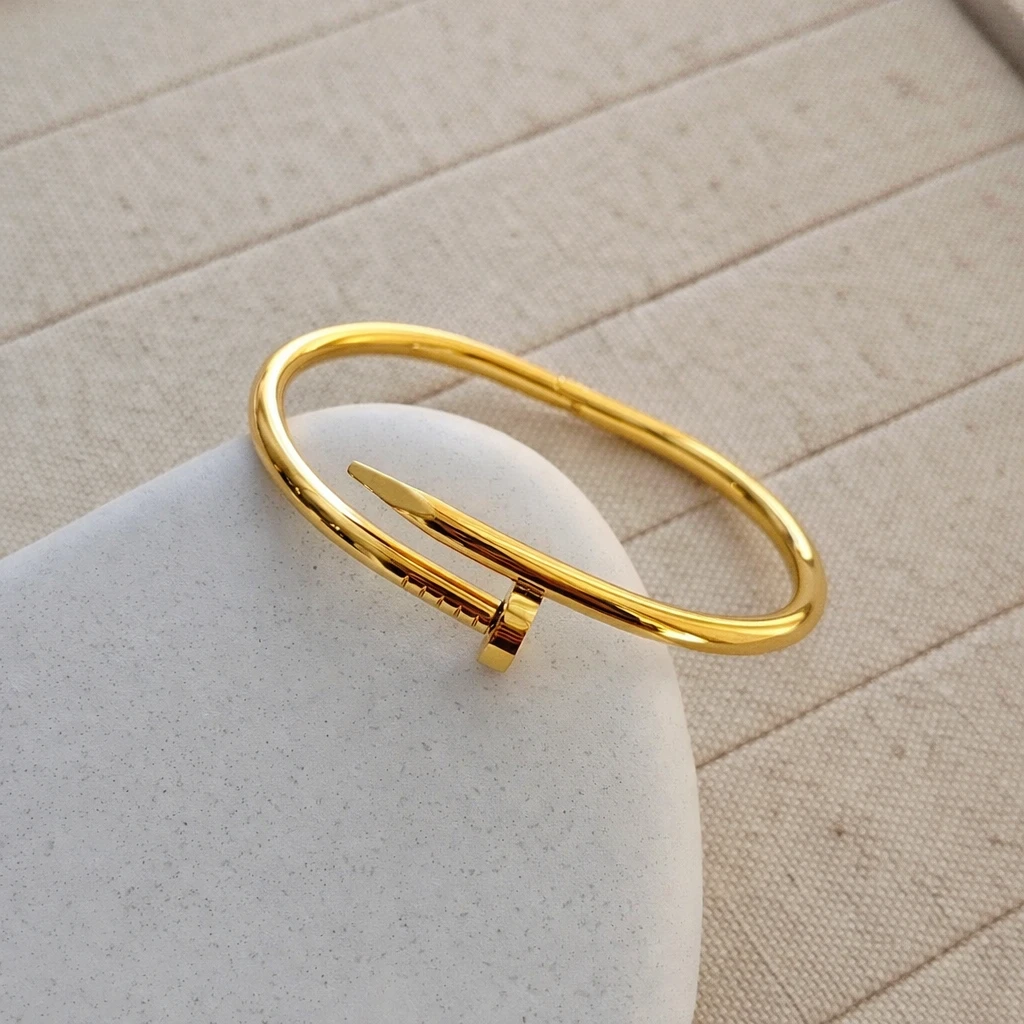 Upgrade your style with this trendy Gold Plated Nail Bracelet for Women, designed to give a bold and luxurious look. Inspired by modern designer fashion, this nail-shaped bangle features a sleek screw-style design that adds a unique and stylish touch to your outfit.