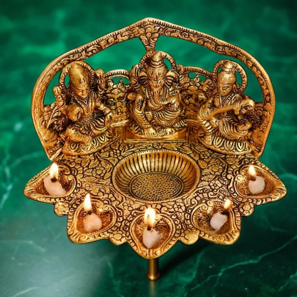 Material :- Allumnium Color :- Golden Size (Length X Width X Height) :- 24 X 14 X 14 CM Weight (gms) :-450 Bring divine elegance into your home with this exquisite metal diya stand featuring the sacred trinity of Goddess Laxmi, Lord Ganesh, and Goddess Saraswati. This intricately crafted gold-toned showpiece combines traditional artistry with functional beauty, featuring five built-in diyas arranged in a graceful arc beneath the deities. The detailed metalwork showcases elaborate floral patterns and traditional motifs, creating a stunning visual impact. Perfect for Diwali celebrations and daily worship, this diya stand serves both as a spiritual centrepiece and an ornate decorative element. The carefully positioned diya holders are designed to hold oil or wax lights securely, casting a warm, devotional glow. This versatile piece can enhance your prayer room, living area, or entrance hall, making it an ideal choice for festive gifting or home decoration. The durable metal construction ensures long-lasting beauty while maintaining its ceremonial significance. |