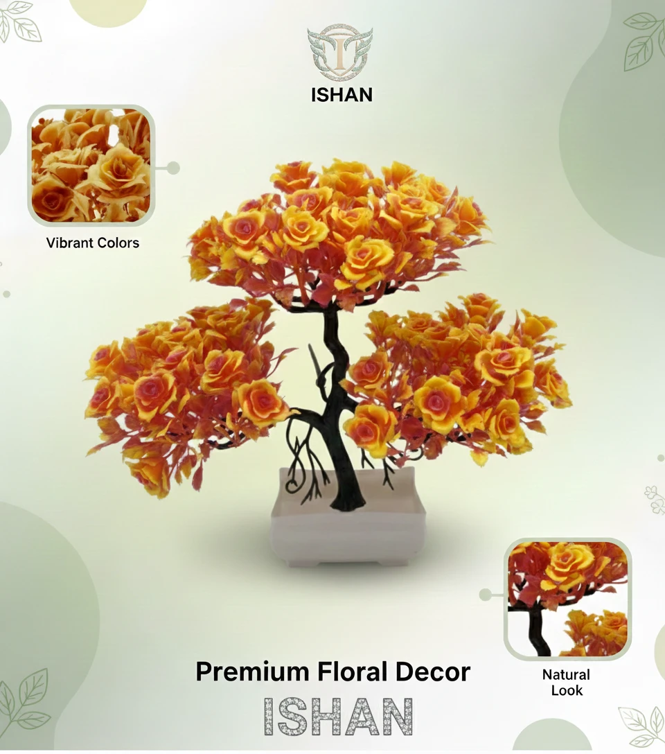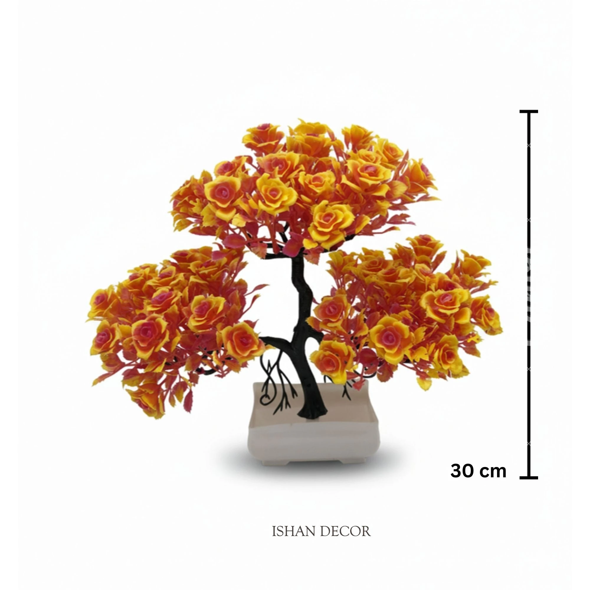Add a touch of elegance to your home with the Ishan Decor Artificial Orange Rose Flower Pot. Designed in a beautiful bonsai style, this decorative plant features vibrant orange rose flowers arranged on an artistic artificial tree. This handmade decorative flower pot is perfect for enhancing the beauty of your living room, office desk, study table, bedroom, or workspace. Unlike real plants, it requires no watering or maintenance while maintaining its fresh and vibrant look all year round.