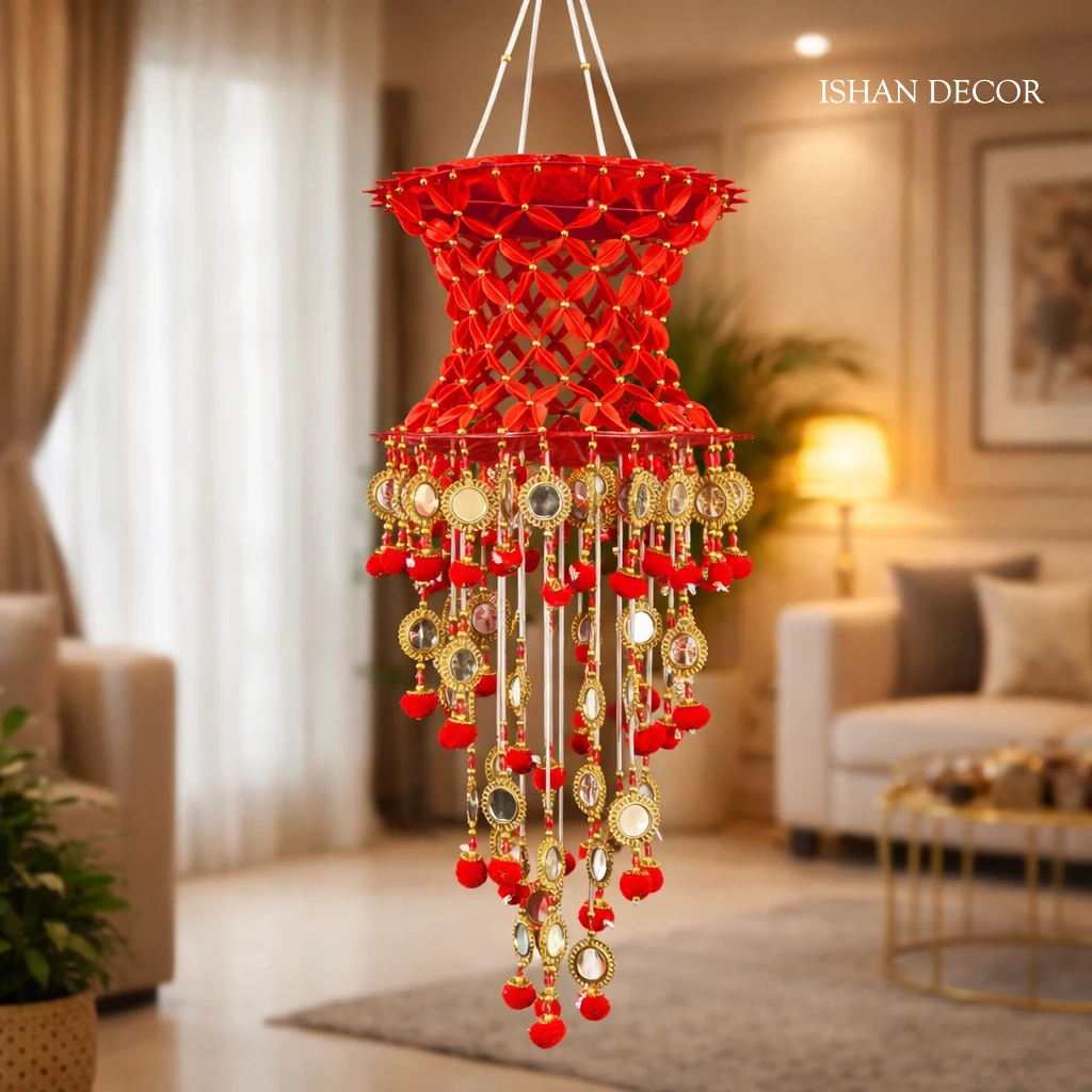 Add a Touch of Royal Elegance to Your Home Enhance your festive decor with the ISHAN DECOR Handcrafted Red Mirror Work Jhoomar. This stunning piece is a masterpiece of traditional Indian craftsmanship, designed to bring warmth and a royal aesthetic to your living space. Featuring a rich crimson red hue paired with sparkling gold accents and glass mirrors, it is the perfect statement piece for any traditional celebration. |